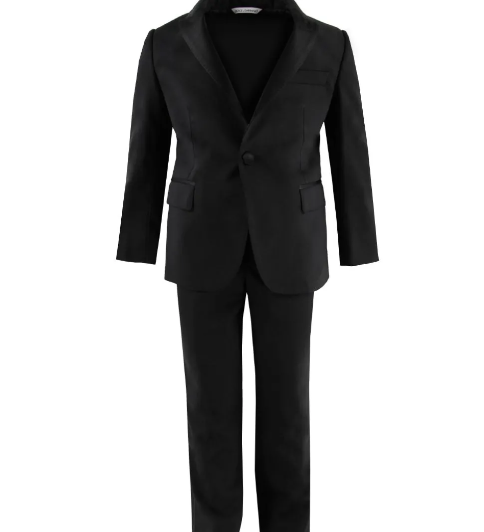 Elegant Dolce & Gabbana jakkesæt i sort med dekorative stikninger langs reversen, og både jakke og bukser har detaljer i en glatvævet kvalitet.