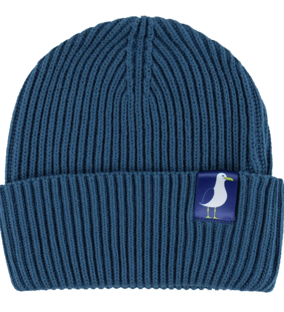 Stilren DYR hue i en dyb, blå farve med en tydelig, ribstrikket struktur. Huen har et opfoldet kantdesign, hvorpå der sidder et flot patch med en mågeillustration.