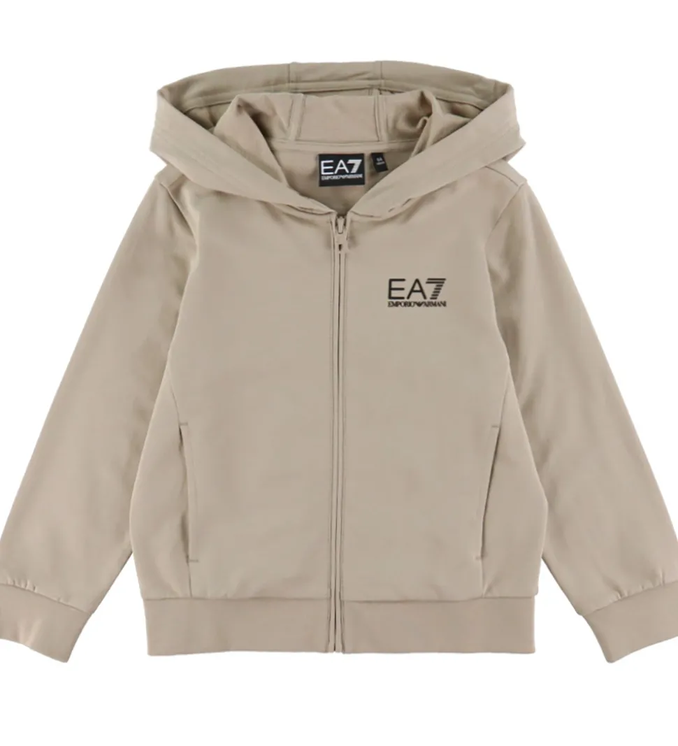 Stilfuldt EA7 sweatsæt bestående af en beige cardigan og sorte sweatpants med diskrete logoprints.