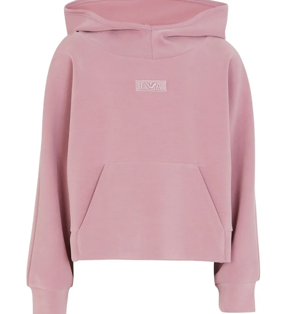 Elegant Emporio Armani hættetrøje i en smuk, støvet rosa nuance. Hættetrøjen har et diskret logo broderet på fronten, der fremhæver det stilfulde design. Den er forsynet med en rummelig kængurulomme. Hættetrøjen har en afslappet pasform, der sikres af ribkanter ved håndleddene.
