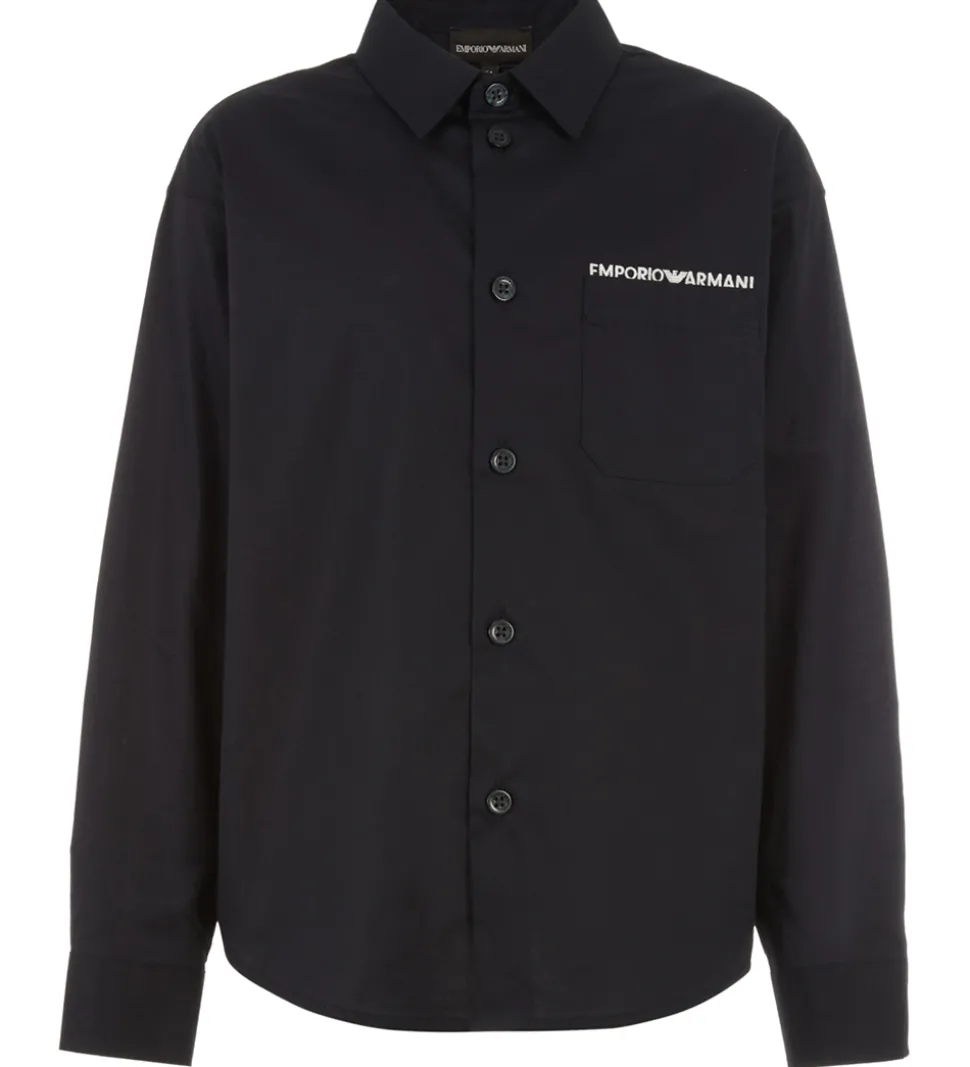Lækker Emporio Armani skjorte i ensfarvet mørk navy i en let strækbar kvalitet, og fortil i venstre side står der “Emporio Armani” broderet i hvid.