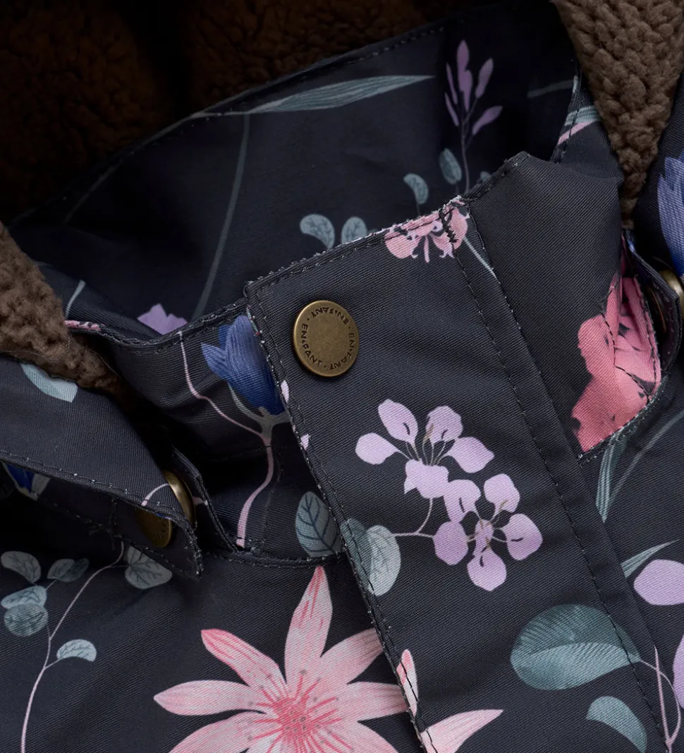 Pæn En Fant flyverdragt i mat sort med et alloverblomsterprint i rosa, lilla, blå og grønne farver. Flyverdragten er med refleksprint og -pipings og har flotte flæser over skuldrene.