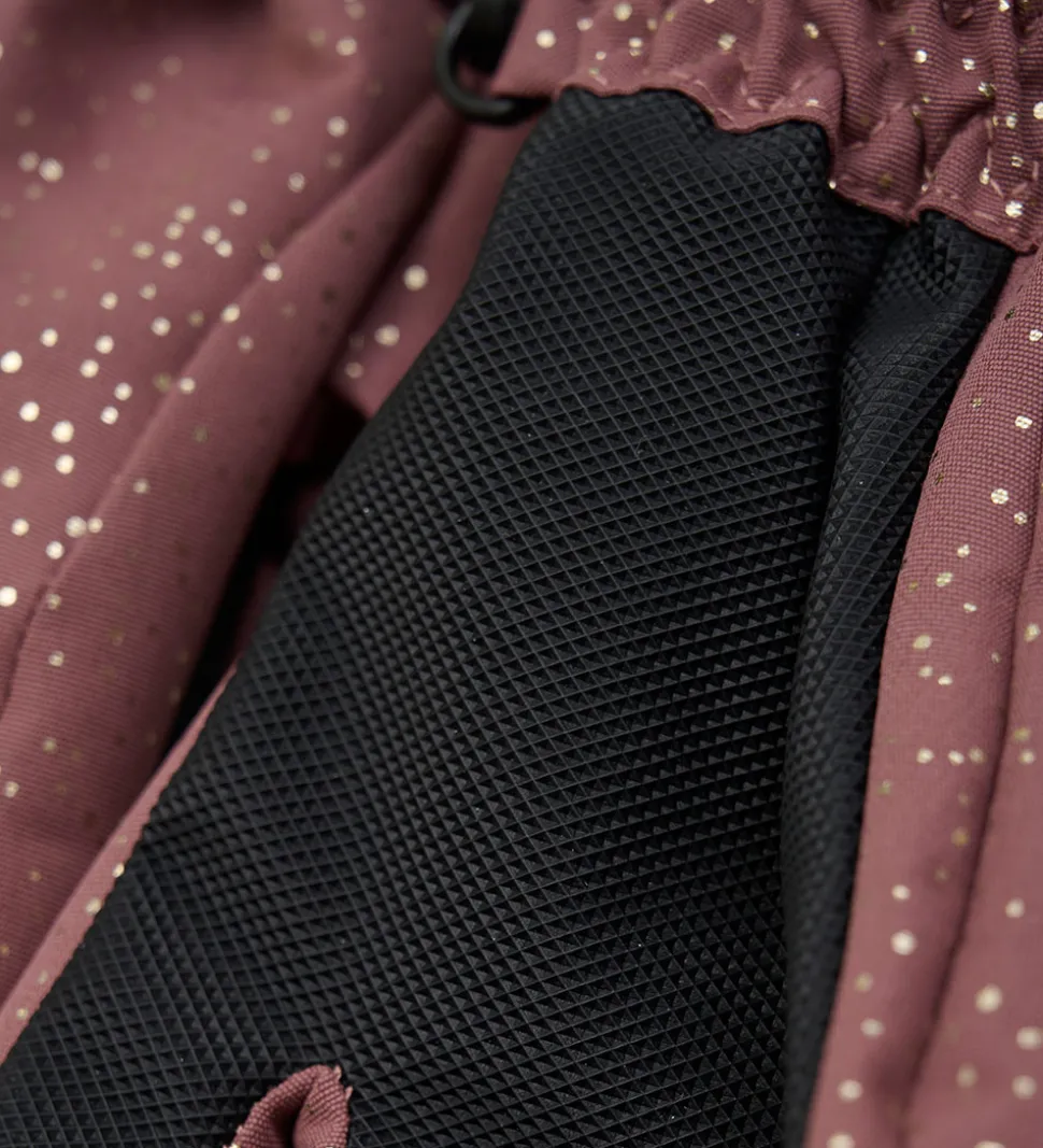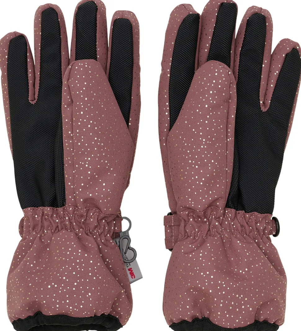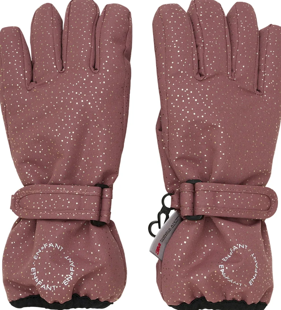 Fine En Fant handsker i mørk rosa med guldprikker over det hele. Handskerne har refleksprint og sorte detaljer.
