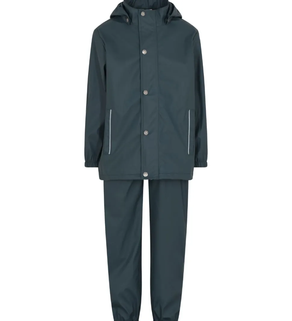Lækkert En Fant regntøj i PU i støvet blå med sølvfarvede knapper. Regnsættet består af en regnjakke og et par regnbukser med seler.