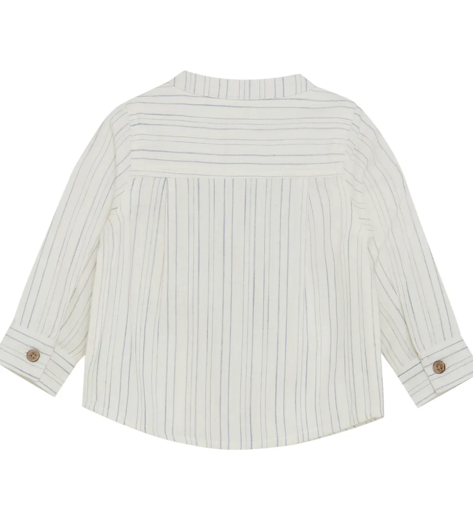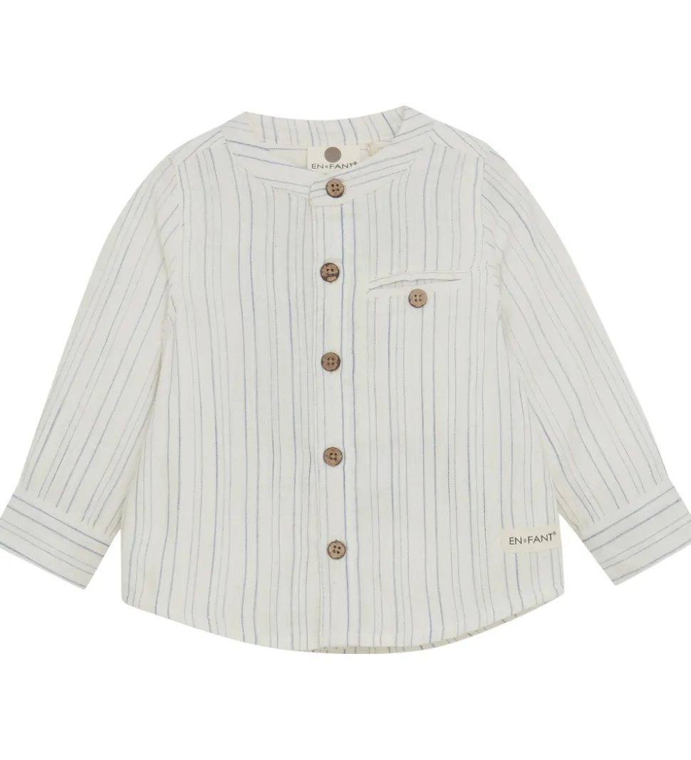 Stilfuld En Fant skjorte i hvid med smalle, blå striber. Skjorten har en fin kinakrave og brune, gennemgående knapper fortil. Skjorten har lange ærmer og en lille brystlomme. Den er fremstillet i en blød og let bomuldskvalitet.