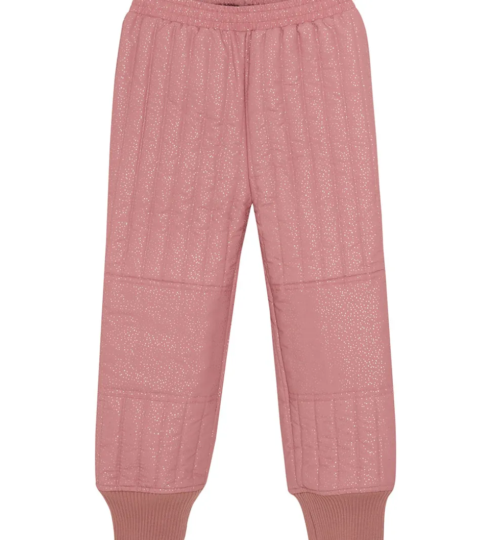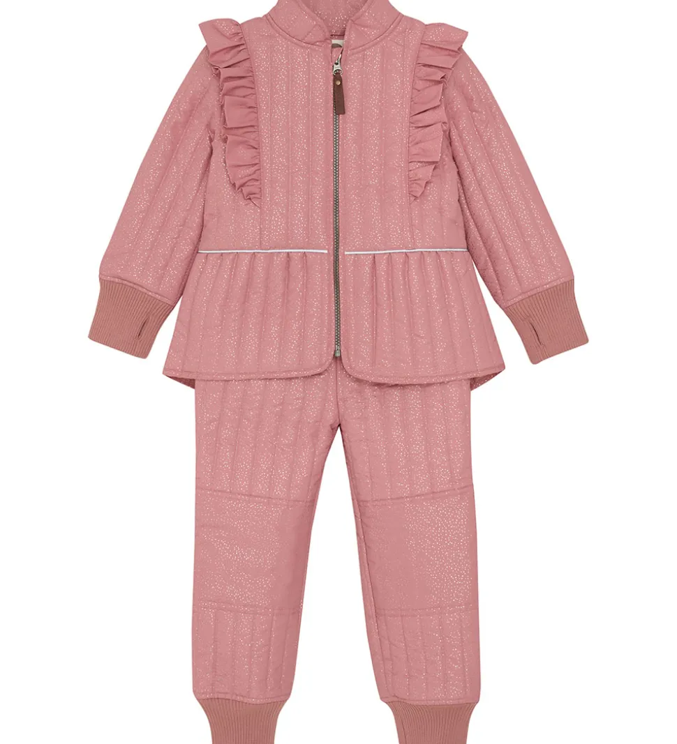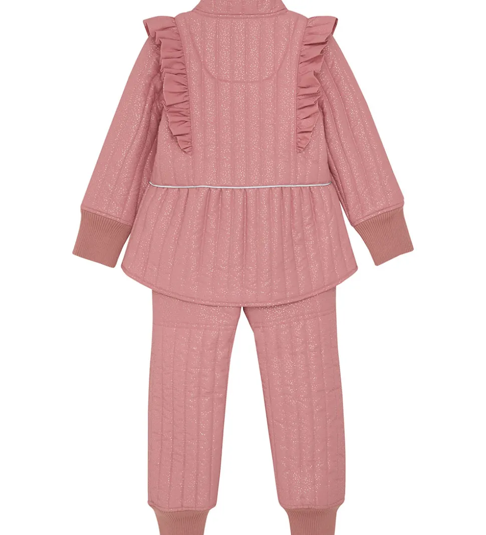 Skønt En Fant termotøj i gammelrosa med glimmer og lodrette syninger samt flotte flæse omkring skuldrene. Sættet består af både en termojakke og et par termobukser.