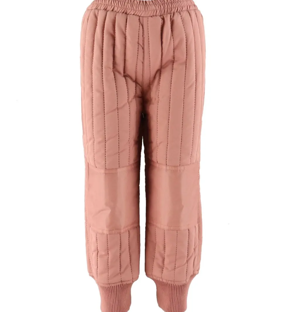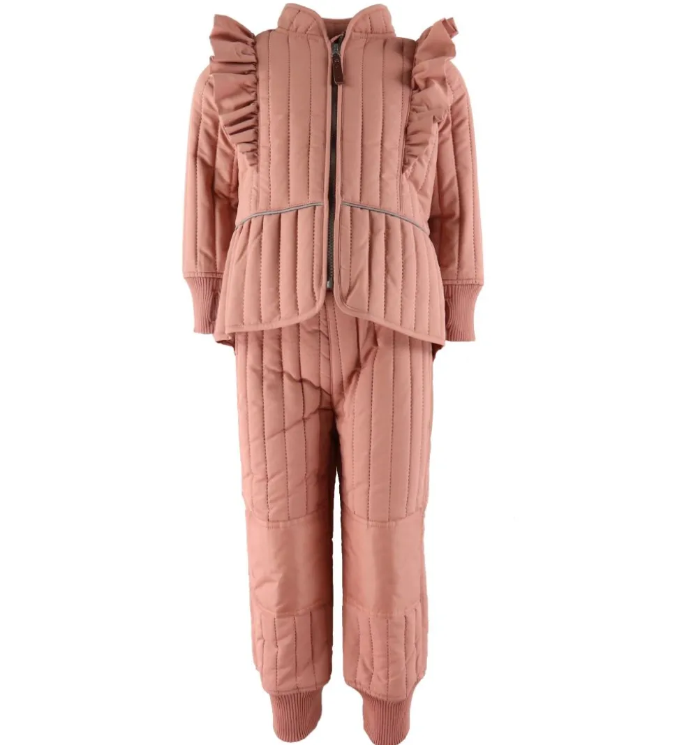 Skønt En Fant termotøj i rosa med lodrette syninger og flotte flæse omkring skuldrene. Sættet består af både en termojakke og et par termobukser.