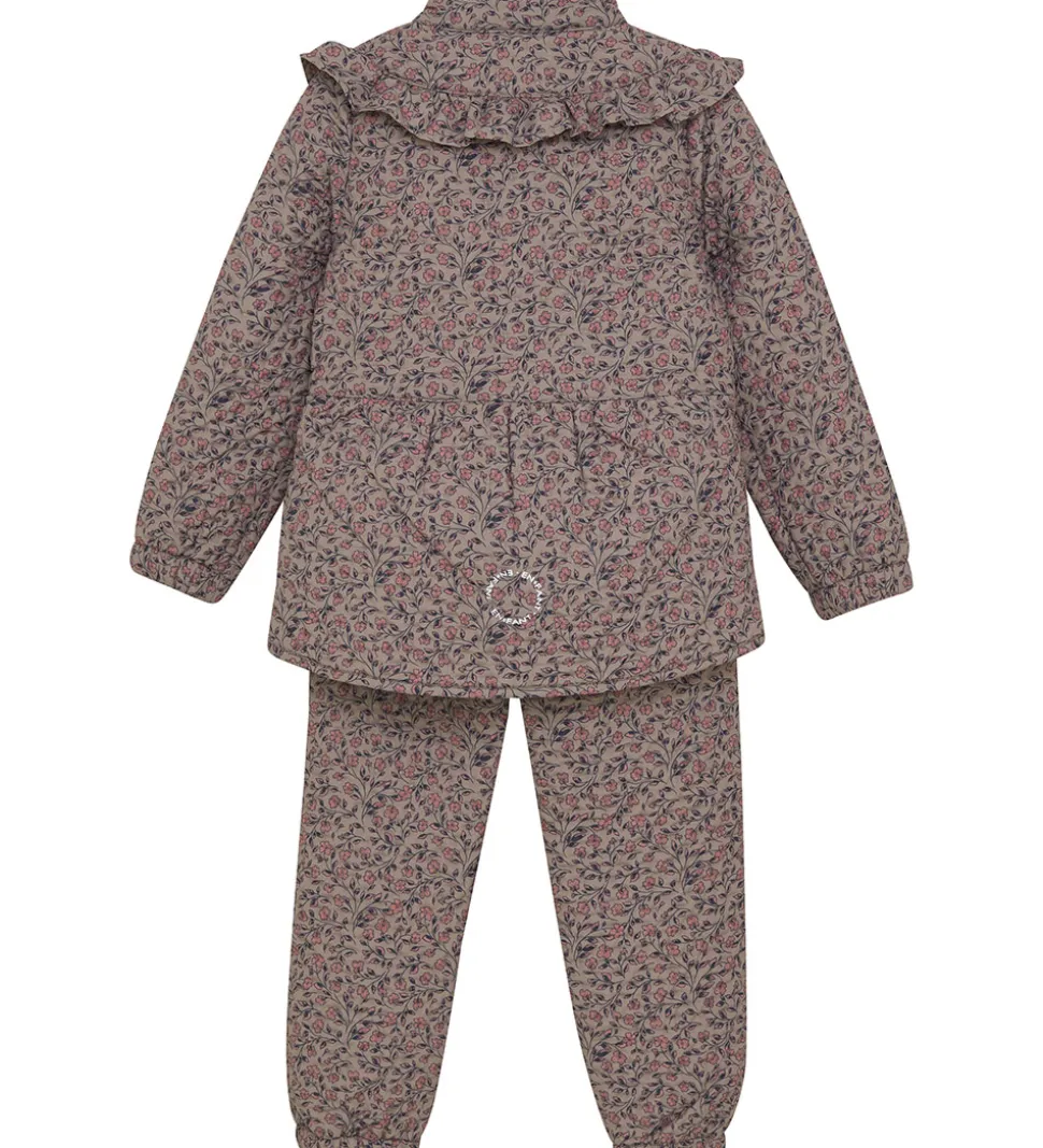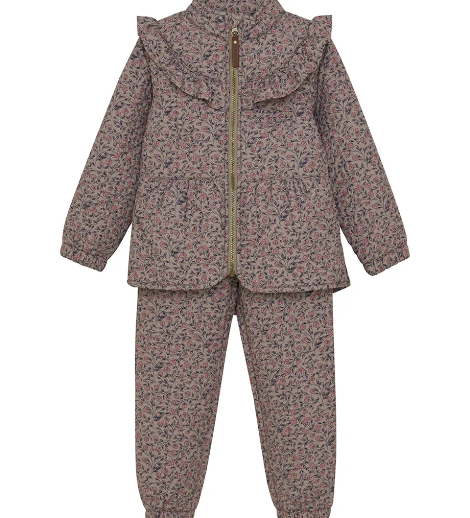 Fint En Fant termotøj i støvet brun med alloverblomsterprint i rosa og med en indpræget, quiltet struktur i runde cirkler. Sættet består af en termojakke og et par termobukser. Termojakken har flæsekant omkring brystet og over skuldrene.