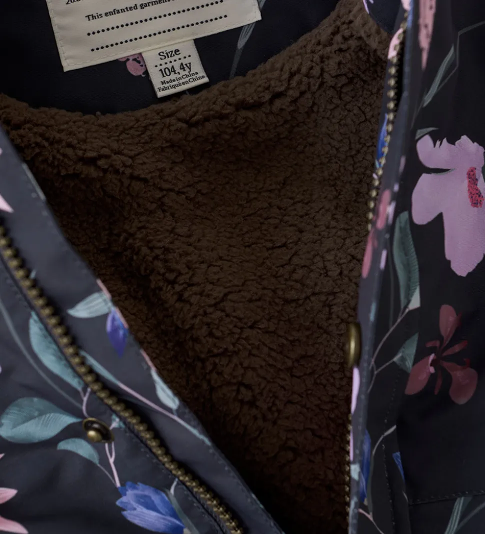 Skøn En Fant vinterjakke i mat sort med et alloverblomsterprint i rosa, lilla, blå og grønne farver.. Vinterjakken har flotte flæser over skuldrene.