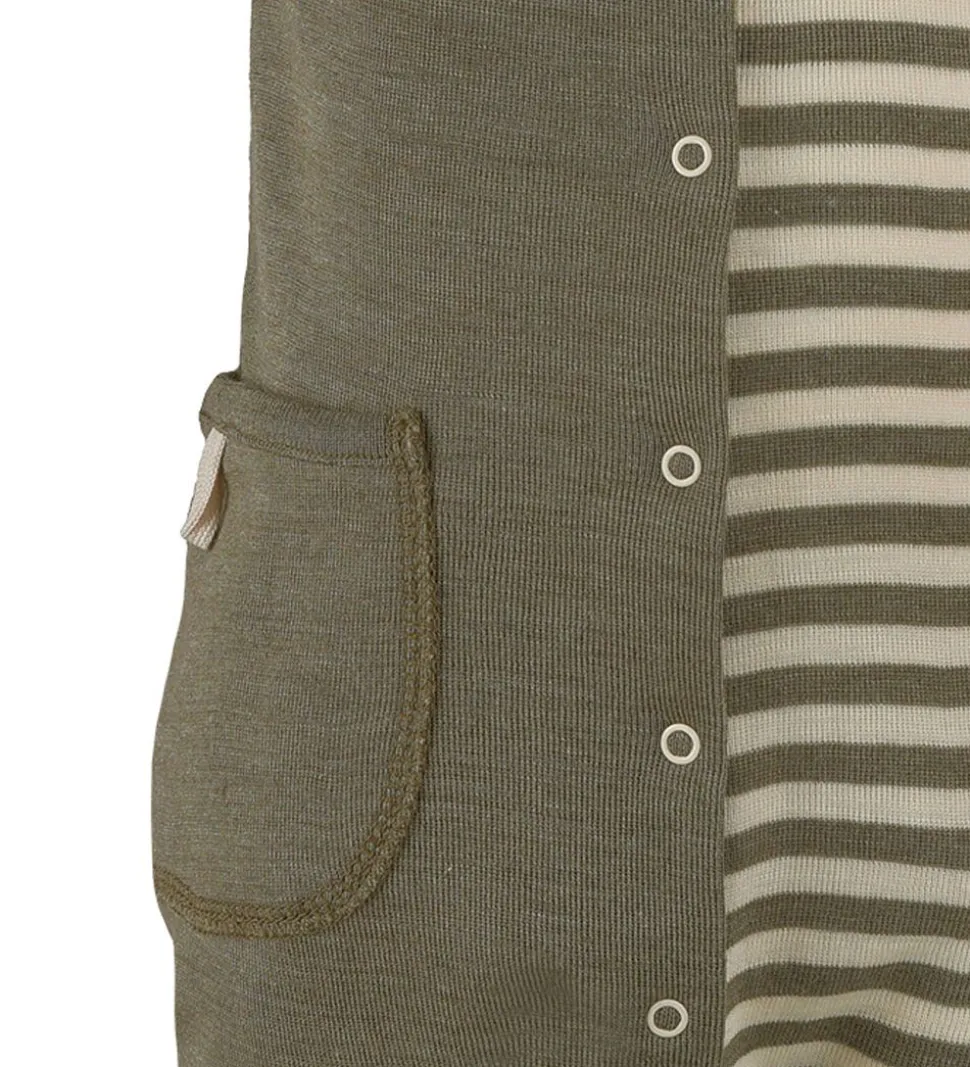 Flot Engel sommerdragt i et to-delt design, hvor højre side af dragten er ensfarvet mørkegrøn, og venstre side af dragten er mørkegrøn- og beigestribet. Bagpå er dragten stribet med ensfarvede ærmer.