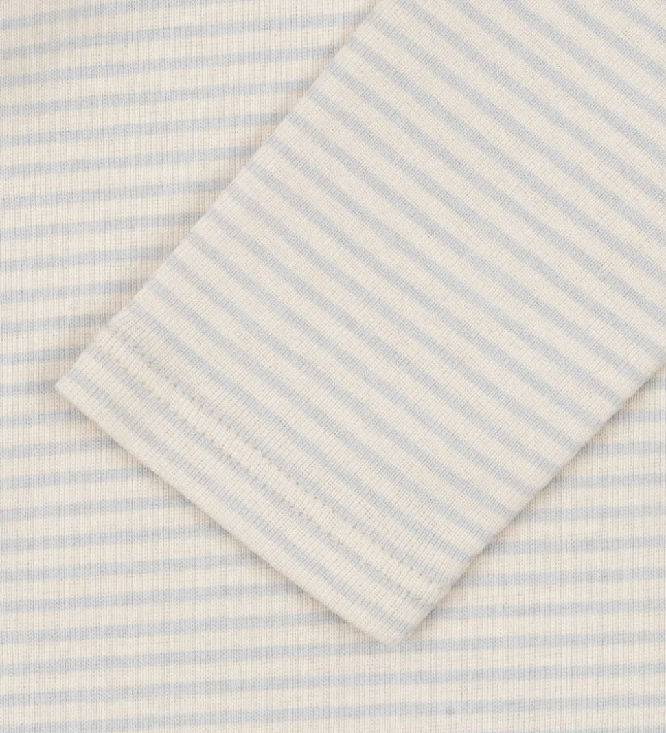Praktisk Fanga Fontana body med lange ærmer og et stribet mønster i bløde nuancer af lyseblå og cremehvid. På brystet ses et enkelt, lille print af to katte. Bodyen er udstyret med ribkanter ved hals og håndled, der giver en god pasform.