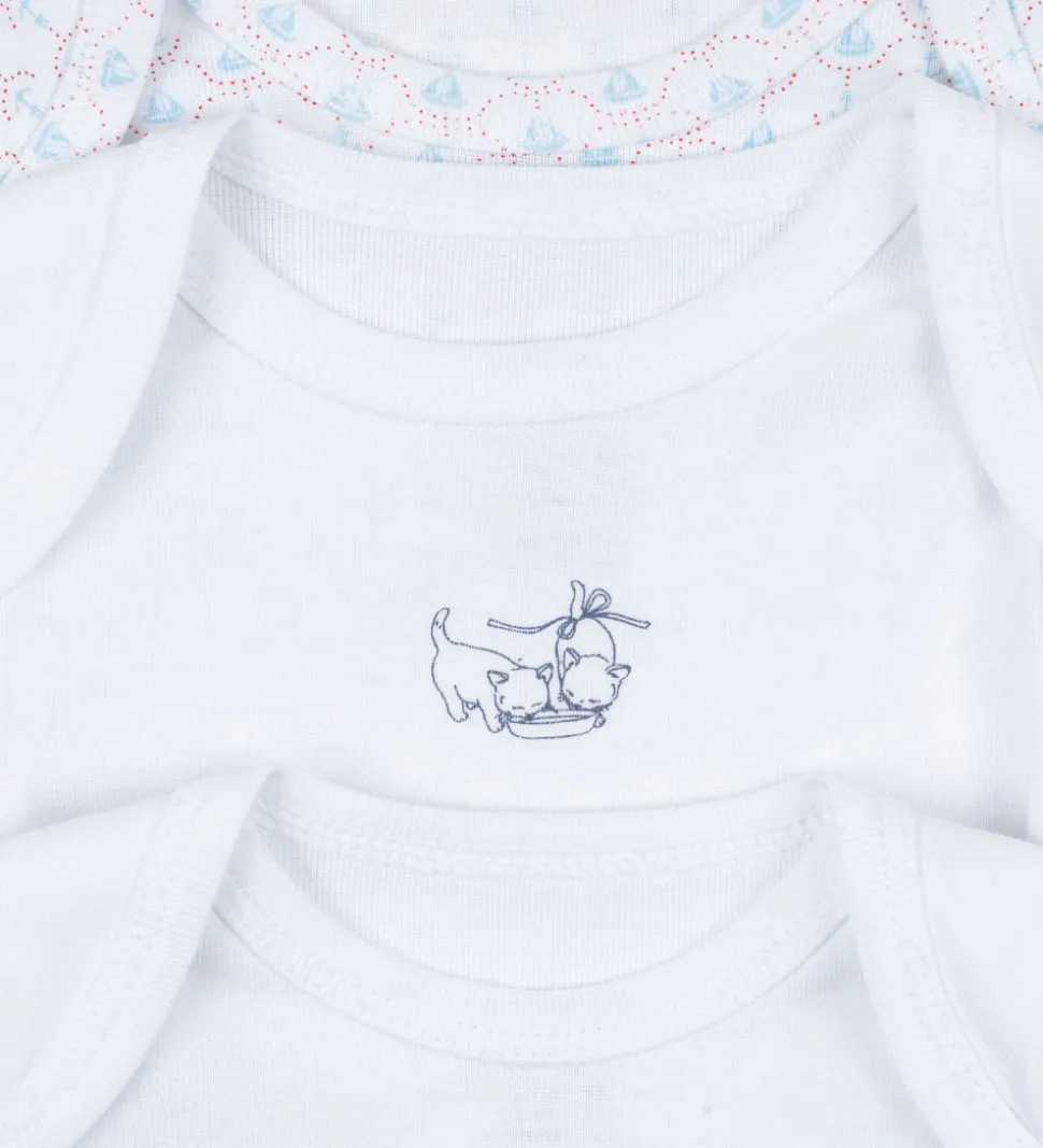 Delikate Fanga Fontana bodyer i et sæt med tre, forskellige designs. To af bodyerne er helt hvide med et lille katteprint på brystet, mens den tredje er hvid og har et fint mønster med små, blå ankre og både samt røde prikker.