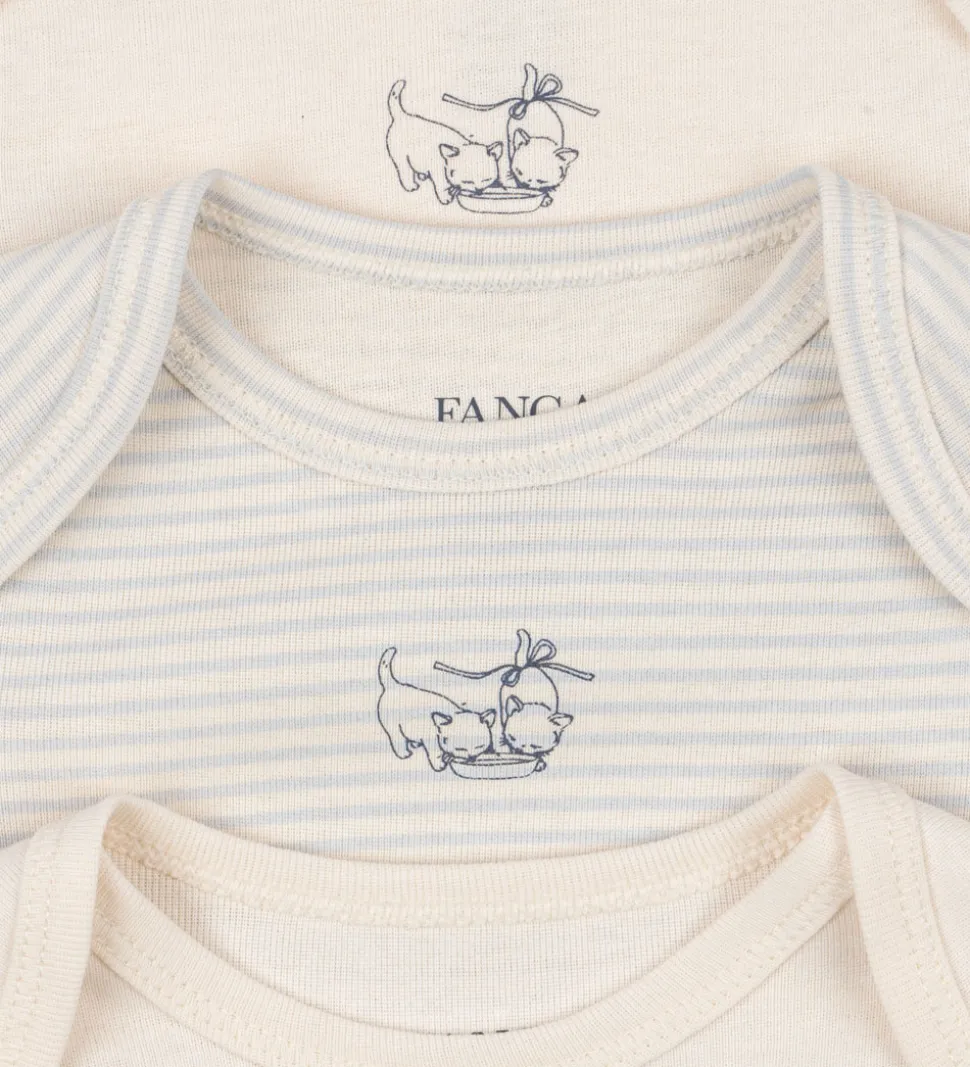 Bløde Fanga Fontana bodyer med lange ærmer solgt i en 3-pak. To i cremehvid med et lille katteprint på brystet, og en med et stribet mønster i cremehvid og lyseblå.