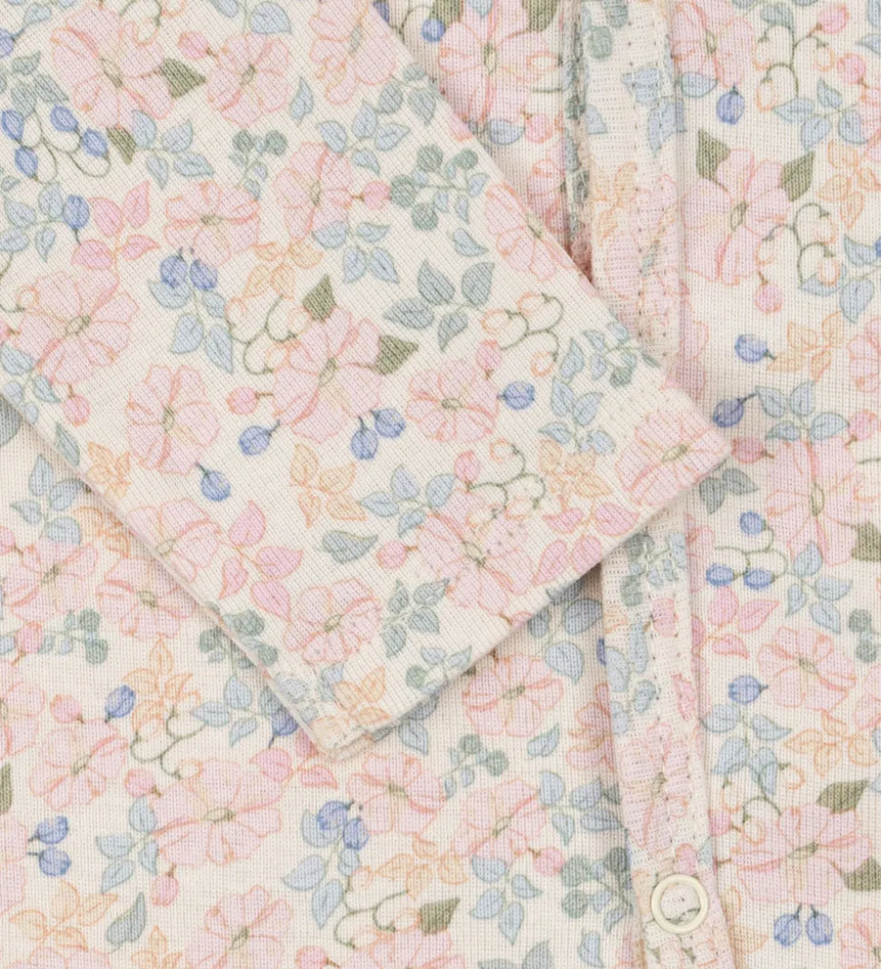Fin natdragt fra Fanga Fontana med lange ærmer. Natdragten har en hvid baggrund med et delikat blomsterprint i farverige nuancer. Fanga Fontana natdragten åbnes asymmetrisk med trykknapper foran, hvilket gør den let at tage af og på.