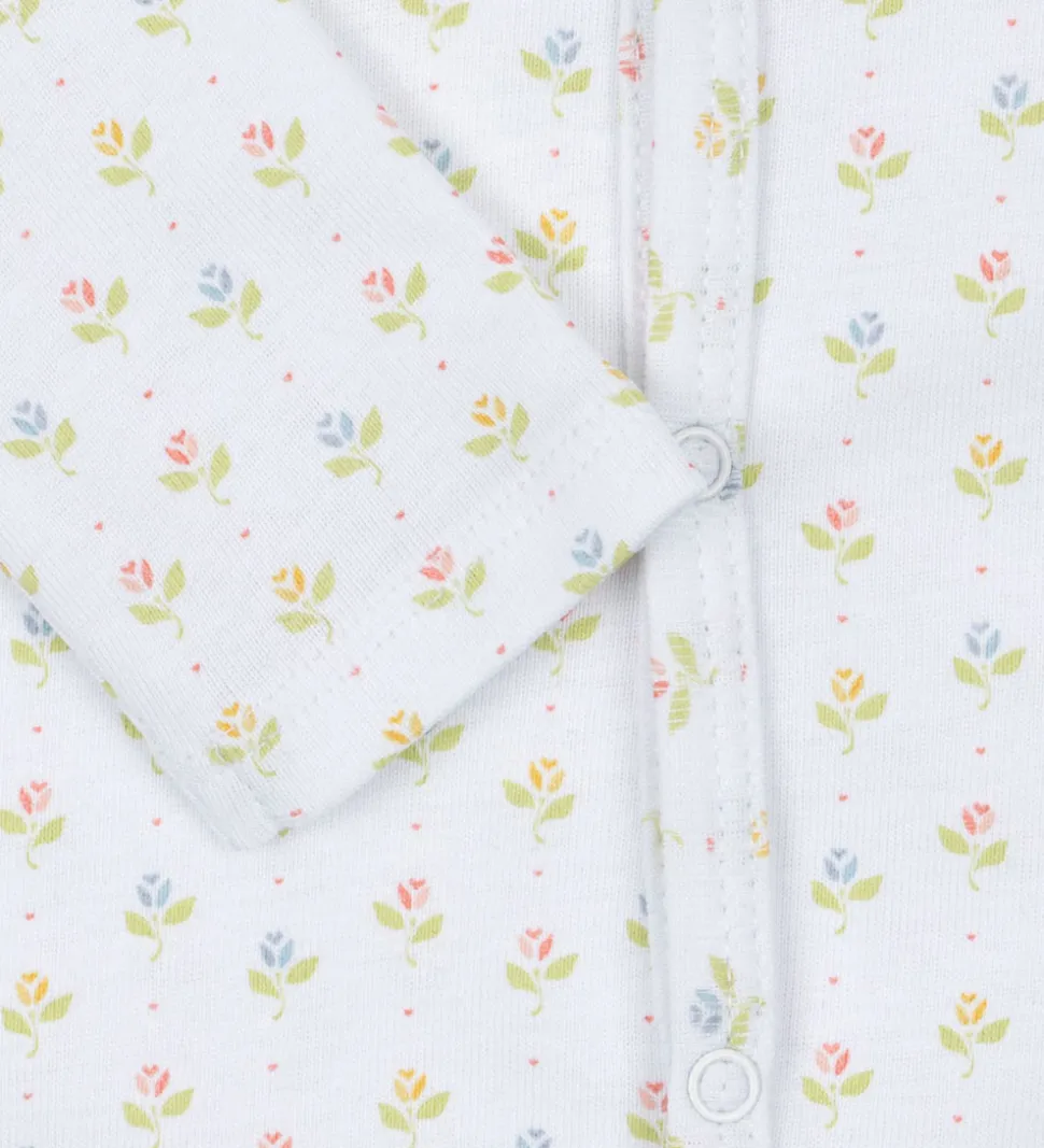 Skøn natdragt fra Fanga Fontana med lange ærmer i hvid og med et farverigt blomstermønster. Natdragten har en praktisk, asymmetrisk trykknaplukning foran, som gør den nem at åbne og lukke.