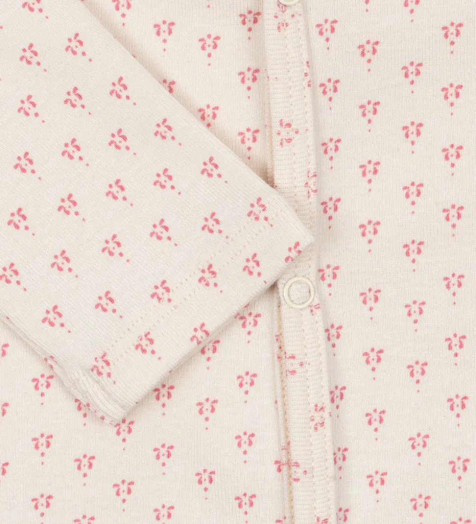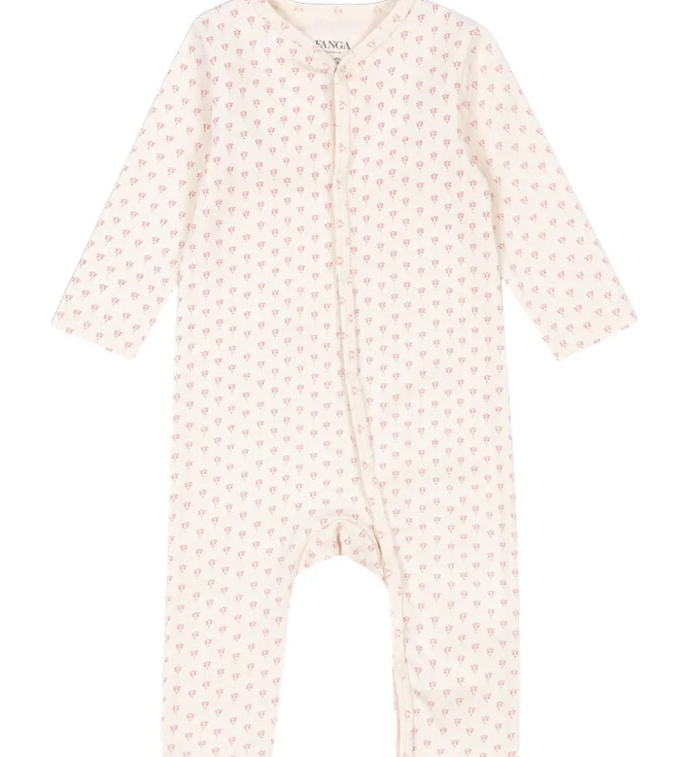 Charmerende Fanga Fontana natdragt med lange ærmer i en blød, cremehvid nuance. Natdragten har et diskret mønster af små, lyserøde motiver. Den er udstyret med trykknapper langs fronten og mellem benene for nem åbning.