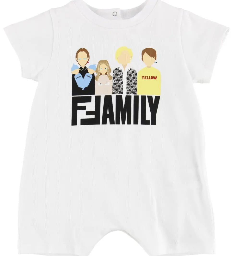 Smart Fendi Kids sommerdragt i hvid med et sort print på fronten med ordet “Ffamily” hvor det andet F står på hovedet, så der bliver dannet et Fendi-logo. Ovenover er der trykt fire mennesker, der bærer tøj fra Fendi Kids.