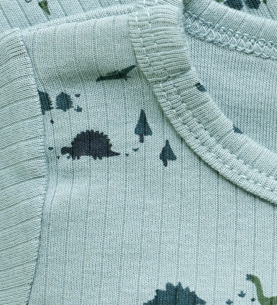 Dejlig Fixoni body med lange ærmer i en støvet lyseblå med dinosaurprint og ribstruktur.