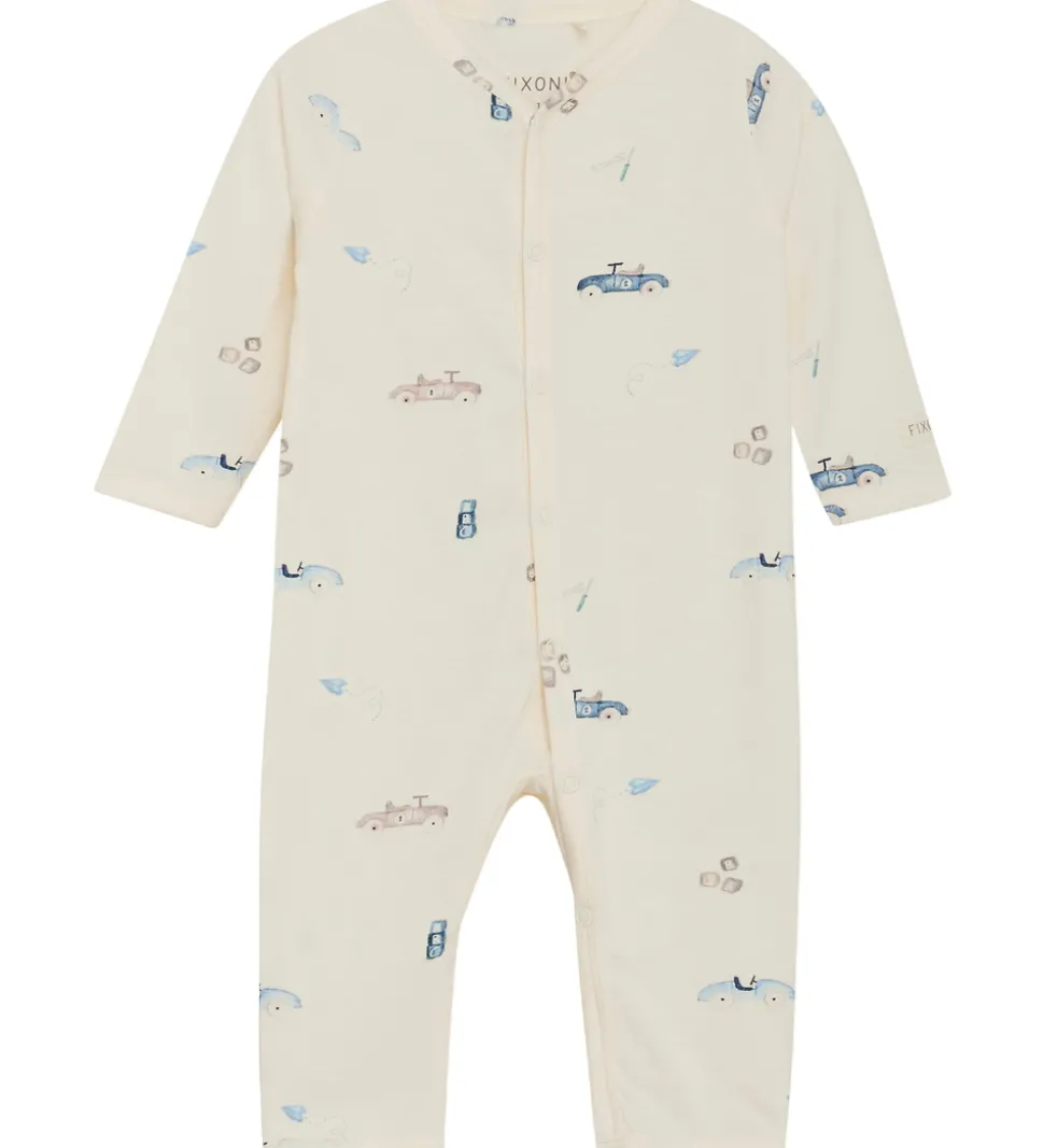Yndig Fixoni heldragt i hvid med et legende bilprint i blå og brune nuancer.