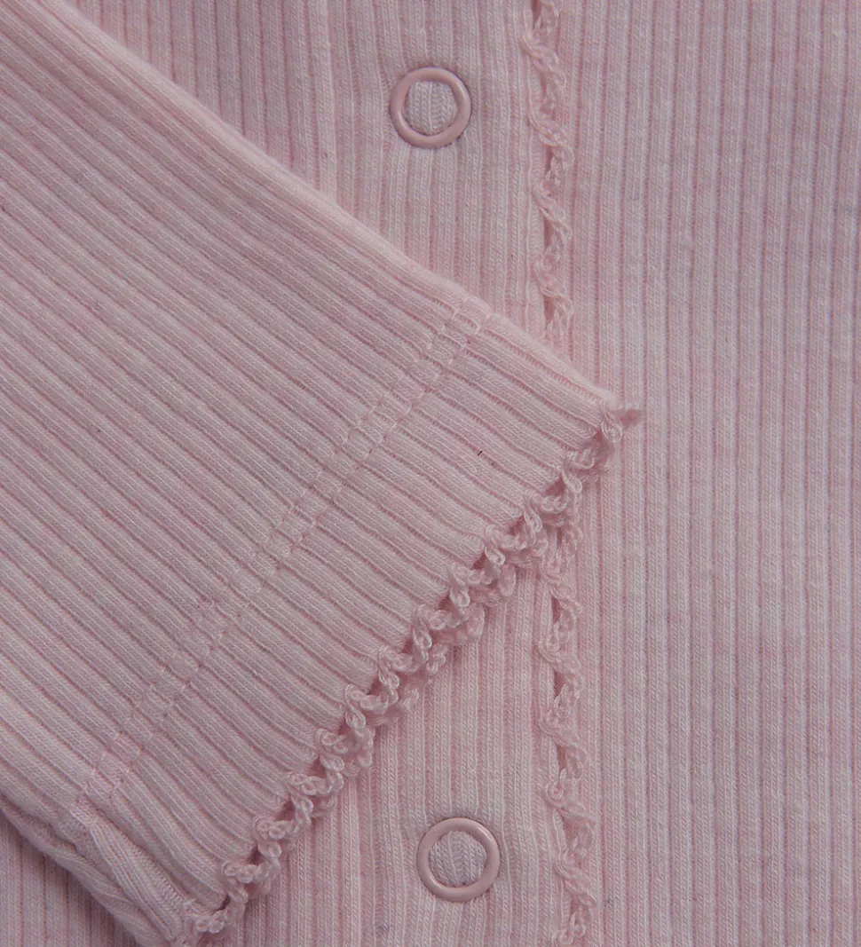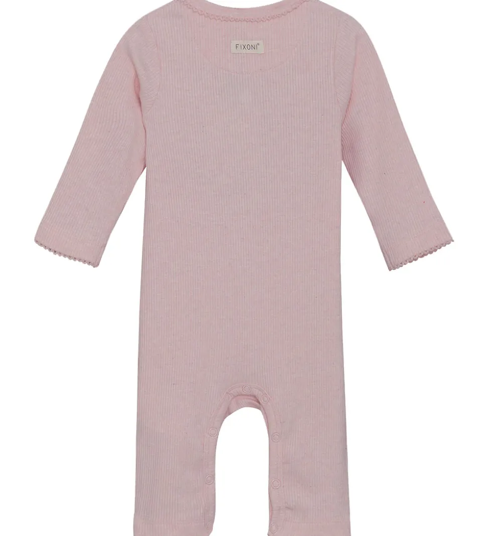 Fin Fixoni heldragt i en sart, rosa farve med en ribbet struktur. Fixoni heldragten har lange ærmer og ben med dekorative kanter ved håndleddene og anklerne. Dragten åbnes fortil og mellem benene med praktiske trykknapper.