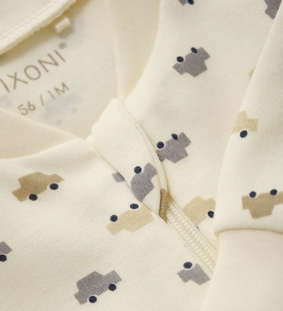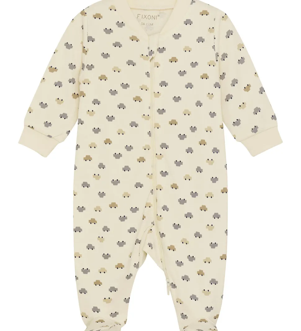 Lækker Fixoni natdragt i hvid med et alloverprint med biler i blå og brune nuancer.