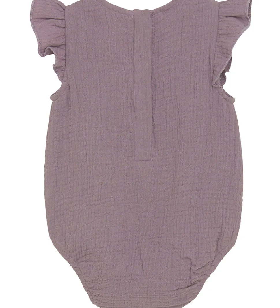 Charmerende Fixoni sommerdragt i en smuk støvet lilla nuance. Sommerdragten har korte flæseærmer og praktiske trykknapper i nakken, som sikrer nem påklædning.