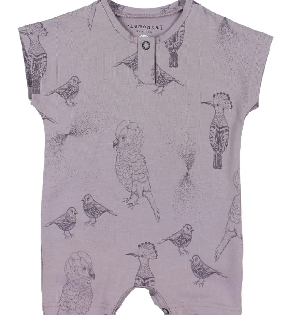 Lækker Fixoni sommerdragt i lilla med flot print af forskellige fugle og prikker.