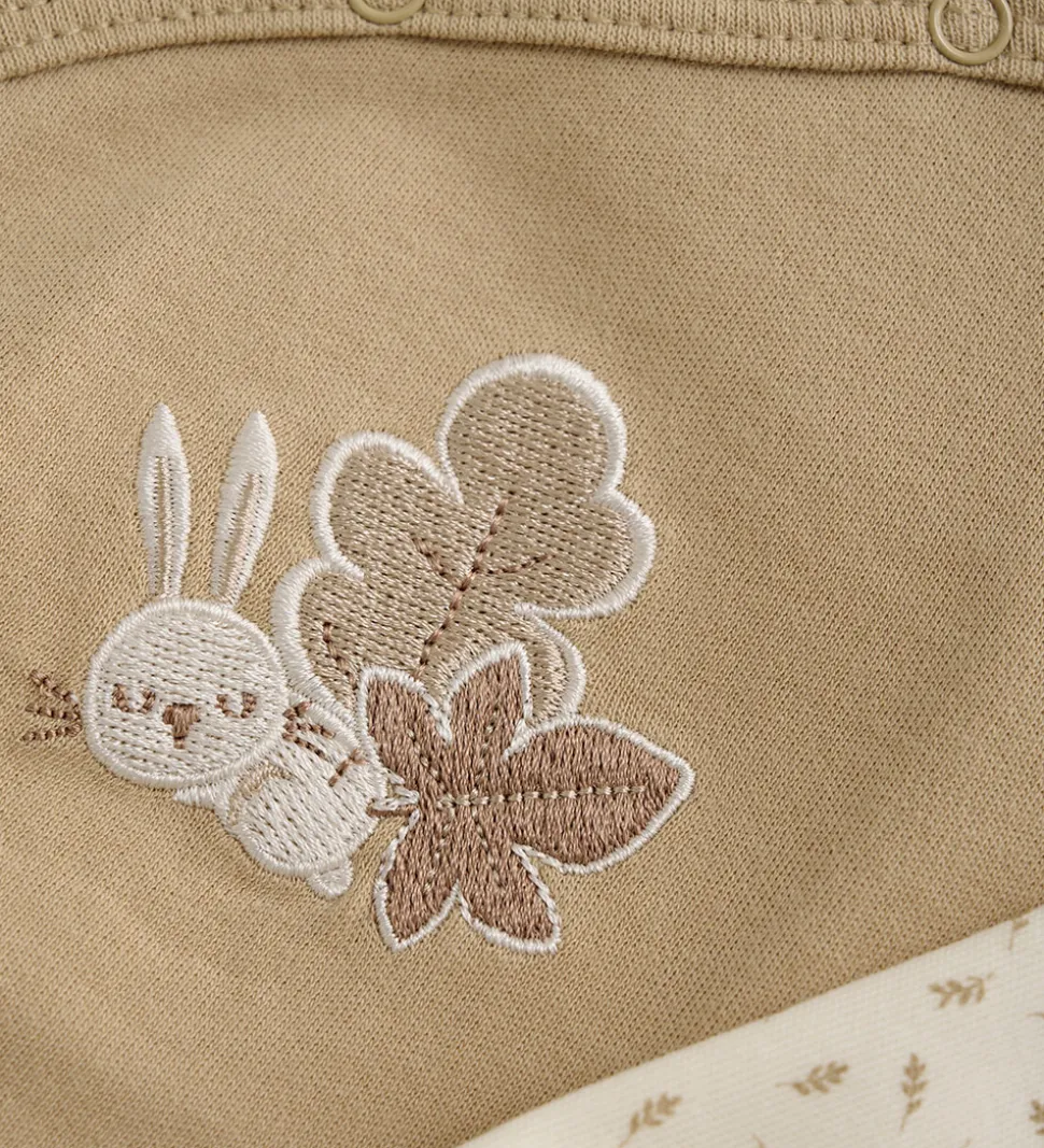 Lækker Fixoni sparkedragt og body. Sparkedragten er lysebrun med med et broderi fortil med en sovende kanin og efterårsblade i hvid og brune nuancer, og bodyen er hvid med et alloverpint med brune blade.