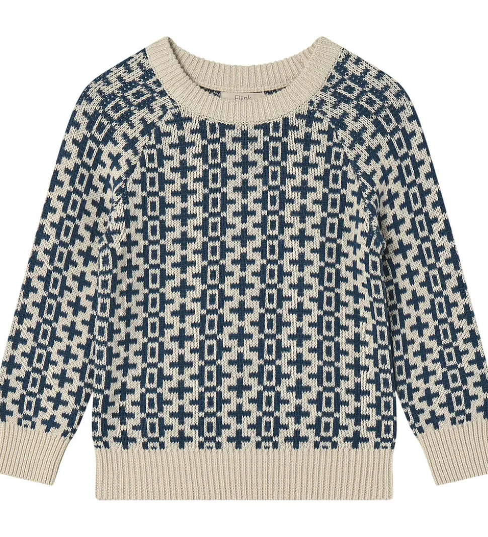 Flot Fliink bluse i lys beige med mørkeblåt mønster. Blusen har en rund halsudskæring og lange ærmer med ribkanter.