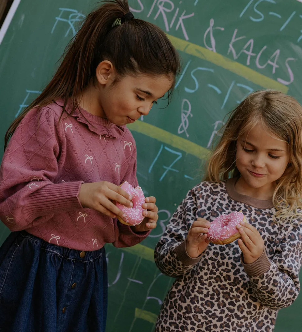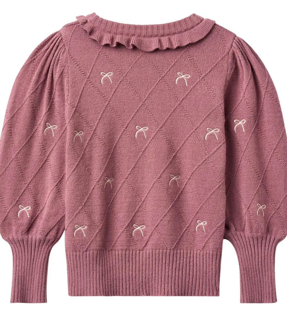 Elegant Fliink bluse i en dyb rosa nuance med broderede sløjfer i hvid. Blusen har en flot strikket struktur med ternet mønster. Den har en rund halsudskæring med flæsekant og lange ærmer med rynker ved skuldrene og brede ribkanter i ærme- og taljeåbning.