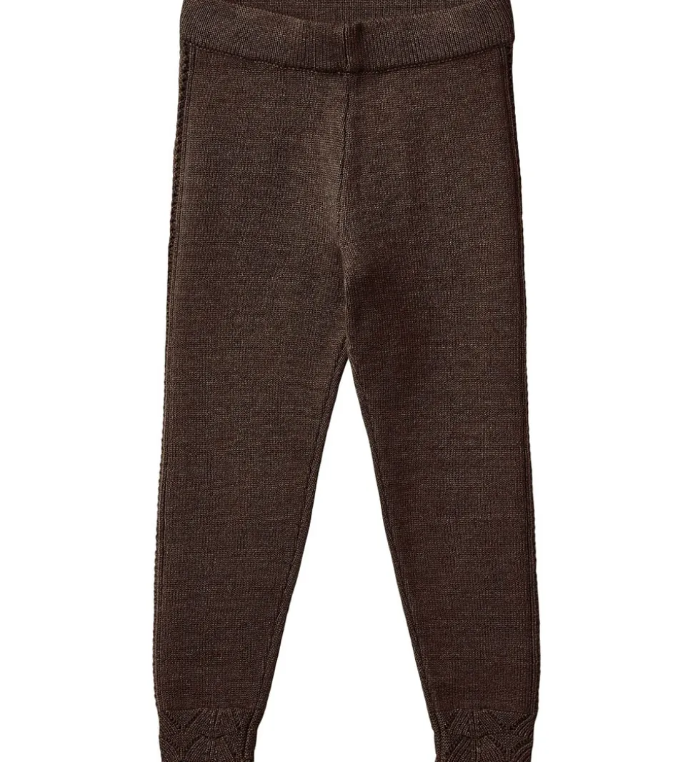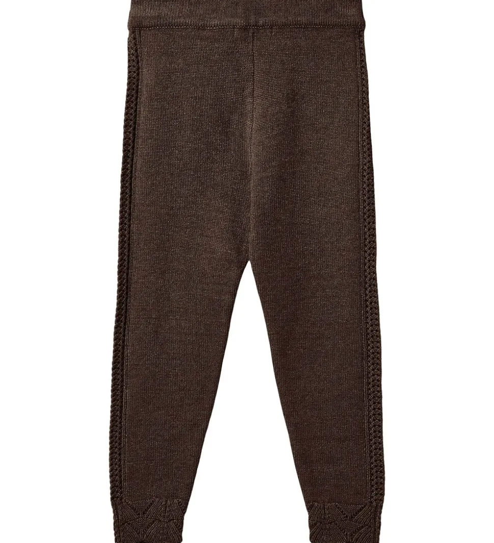 Elegant bukser fra Fliink i mørkebrun strik med hulmønster langs siderne og fin strukturstrik i bunden. Fliink bukserne er fremstillet i en meget blød kvalitet med en elastikkant i taljen, som giver en god pasform.
