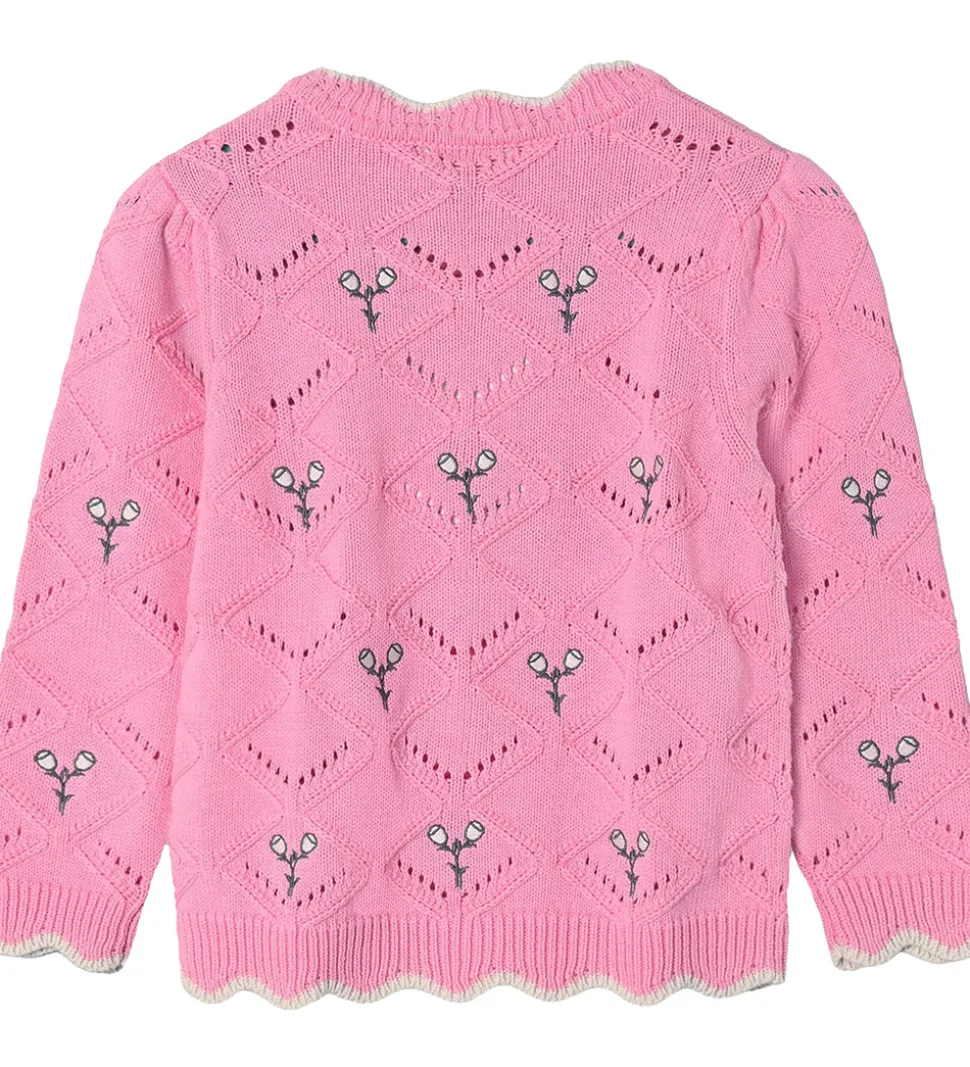 Smart Fliink cardigan i en flot pink nuance. Cardiganen har lange ærmer og er dekoreret med et fint blomstermønster foran. Fliink cardigans design kombinerer stil og funktionalitet på en elegant måde.