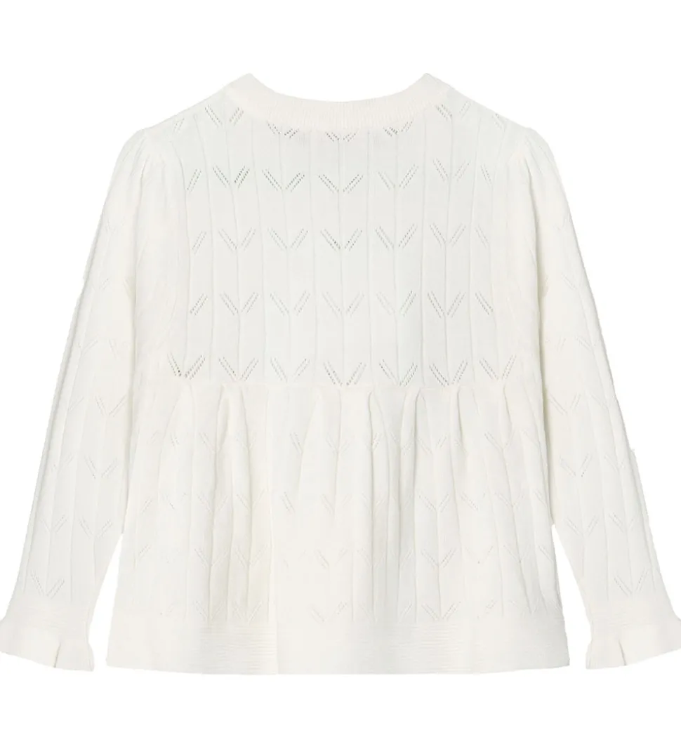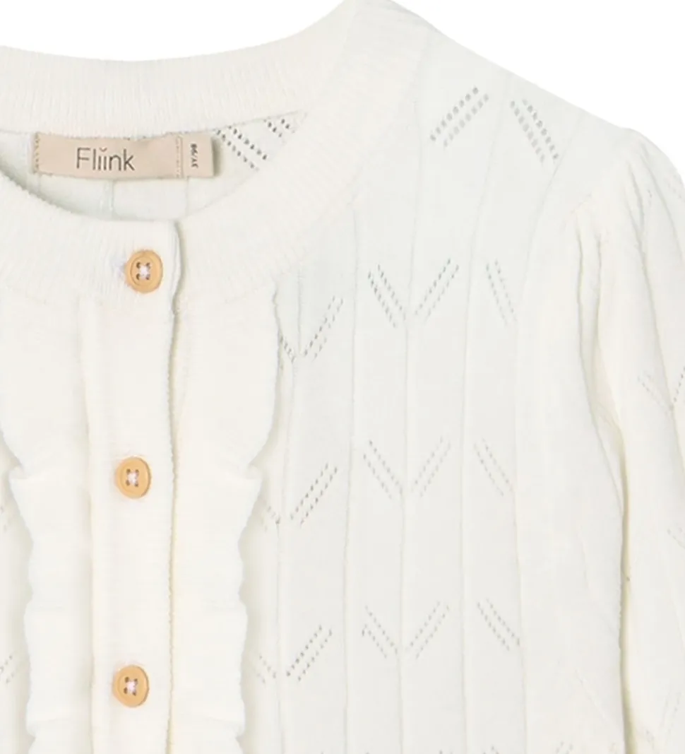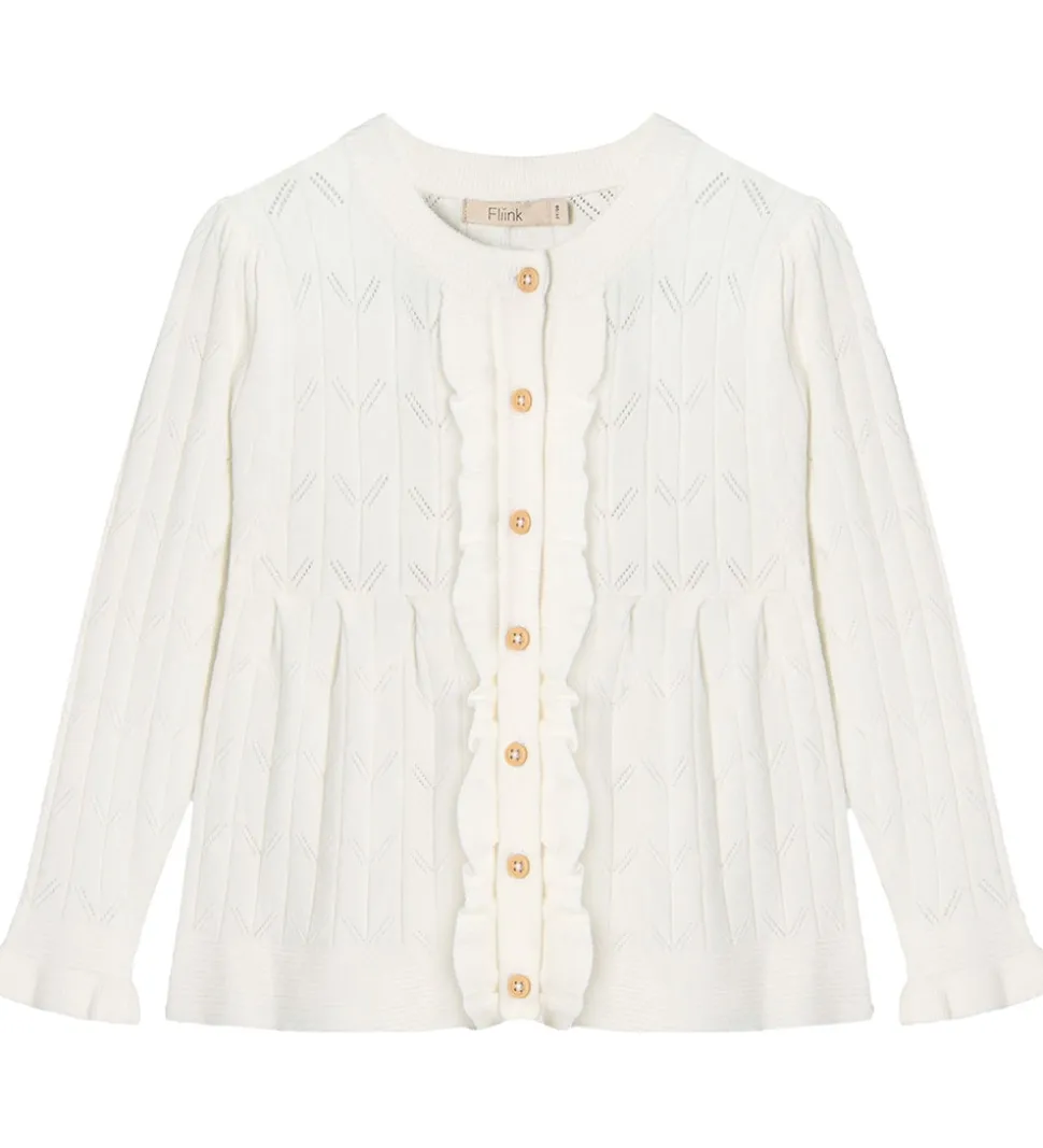 Charmende Fliink cardigan i hvid med fine detaljer. Fliink cardiganen har lange ærmer og flotte knapper ned langs fronten, der giver et klassisk udtryk. Perfekt til garderoben med sit elegante design.