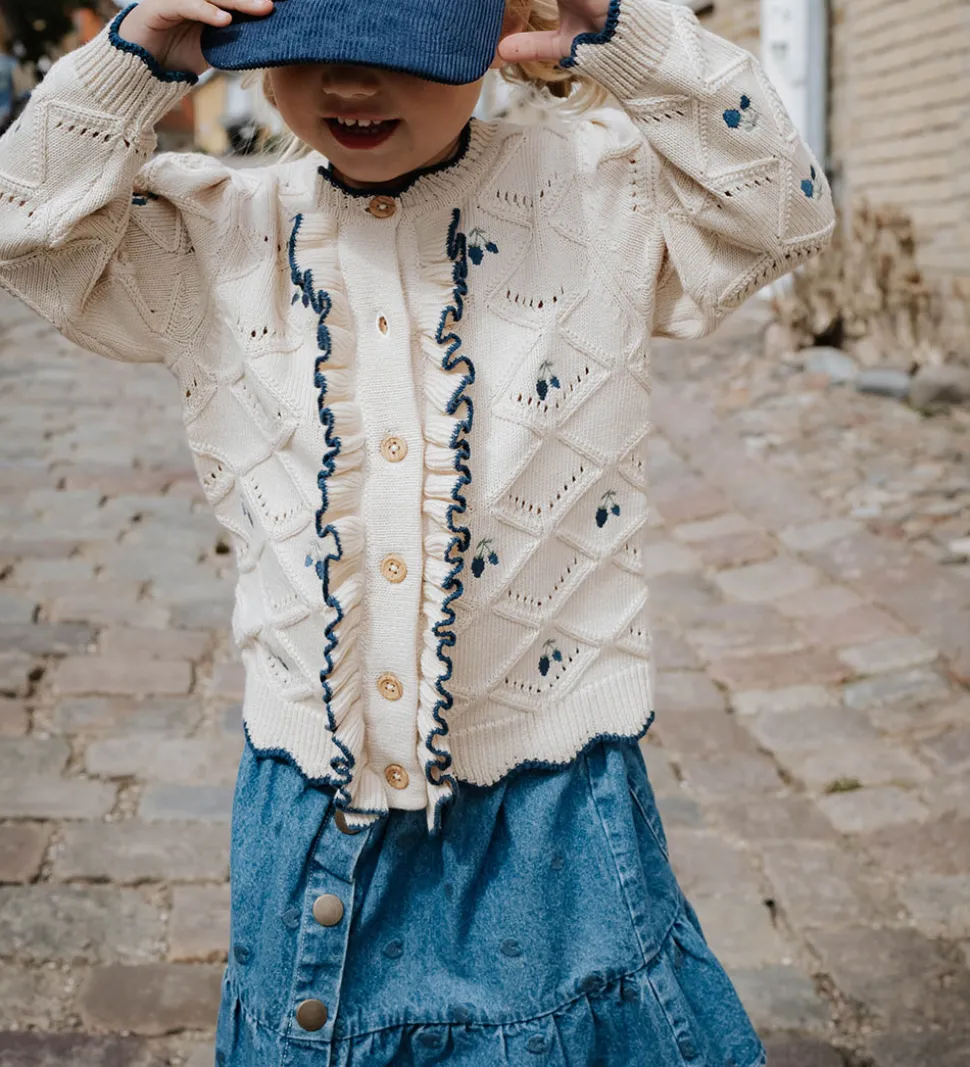 Skøn Fliink nederdel i blå denim med små, broderede hjerter i mørkeblå. Nederdelen har en elastisk talje og gennemgående trykknapper fortil. Bagtil er der to baglommer og nederdelen er skåret på midten, hvor der er fine foldedetaljer.