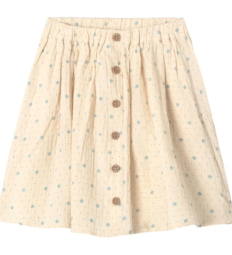 Elegant Fliink nederdel i blød, beige nuance med små, blå blomsterdetaljer og brune prikker. Fliink nederdelen har en elastisk talje, der sikrer en god pasform. Stoffets lette, musselin struktur giver et indbydende udseende.