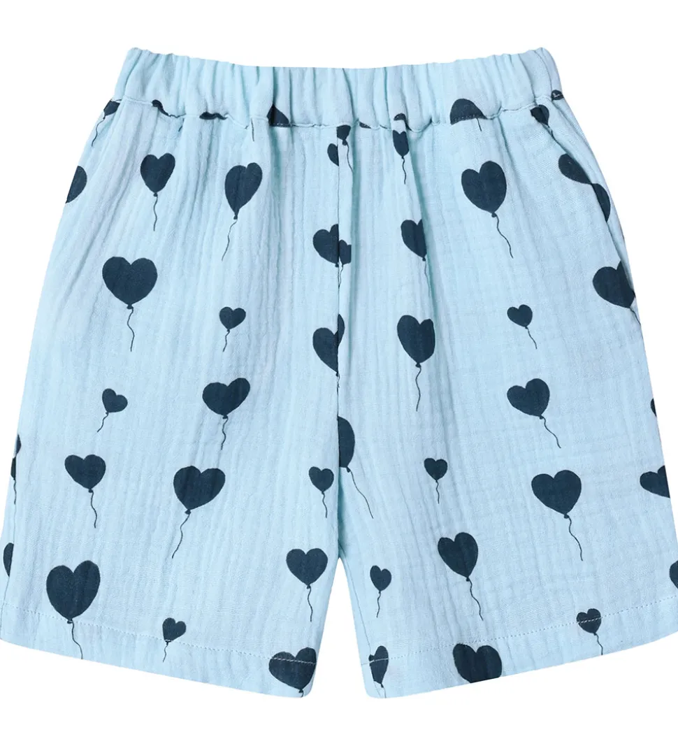 Skønne Fliink shorts i en let lyseblå nuance med et fint alloverprint af balloner i mørkeblå. Fliink shortsene har en komfortabel elastisk talje, der sikrer en god pasform.