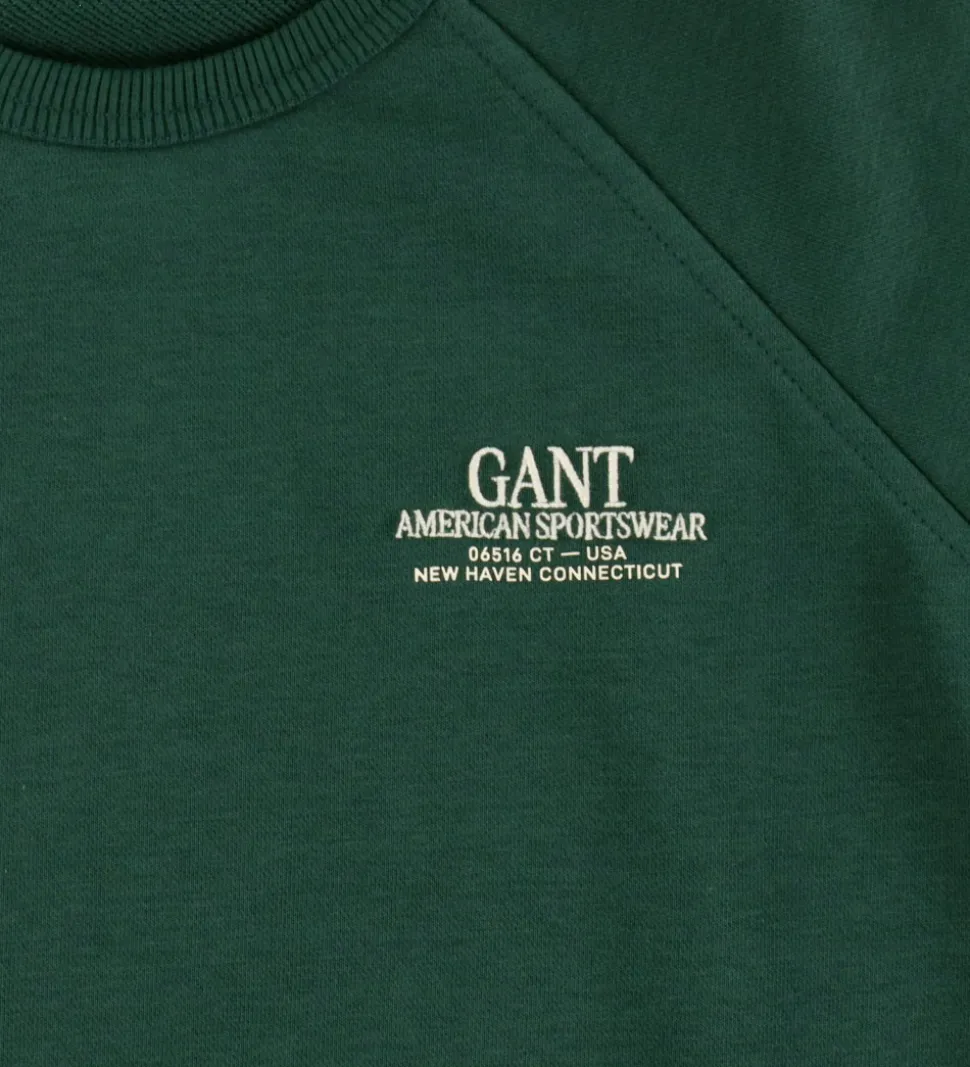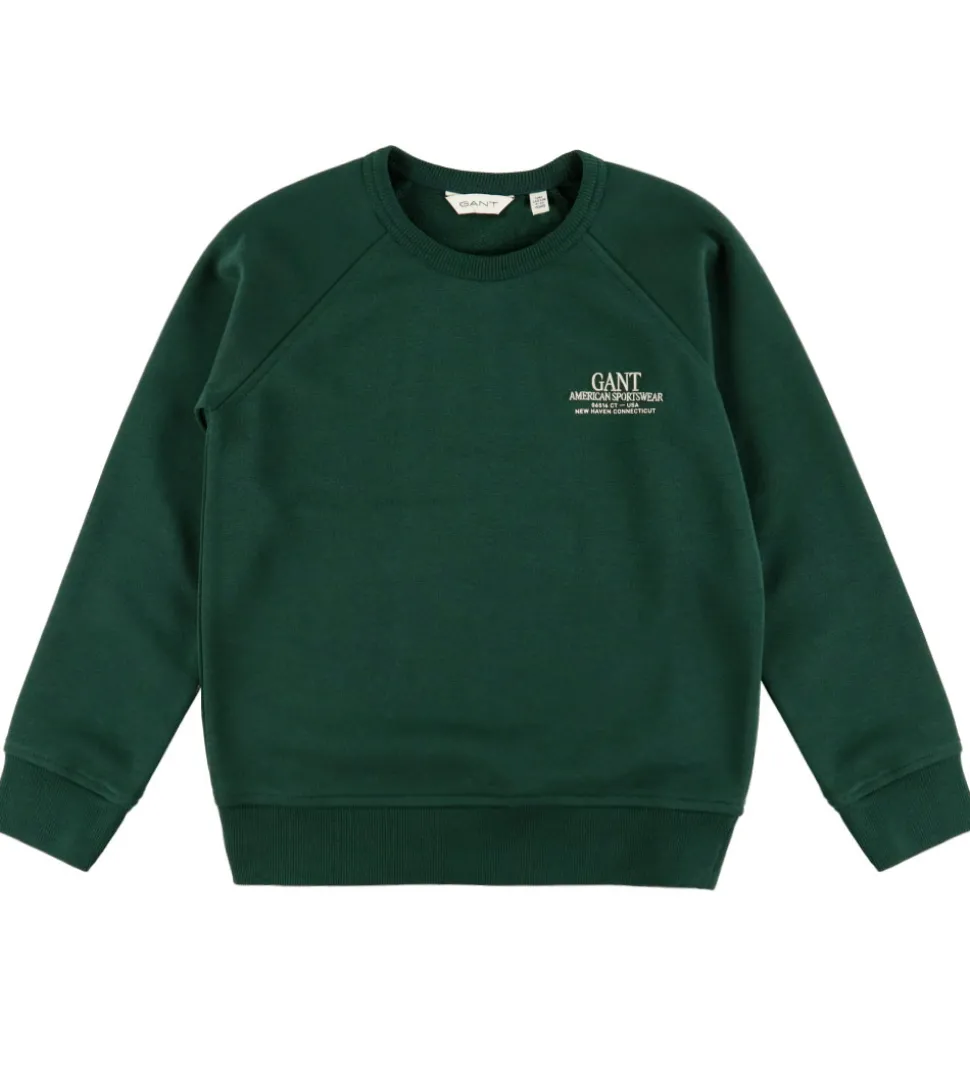 Elegant GANT sweatshirt i en dybgrøn nuance med et lille GANT-logo på brystet. Sweatshirten har lange ærmer og rund hals, som understreger et enkelt og tidløst design. Ribkanter i ærmerne og nederst giver en klassisk afslutning.