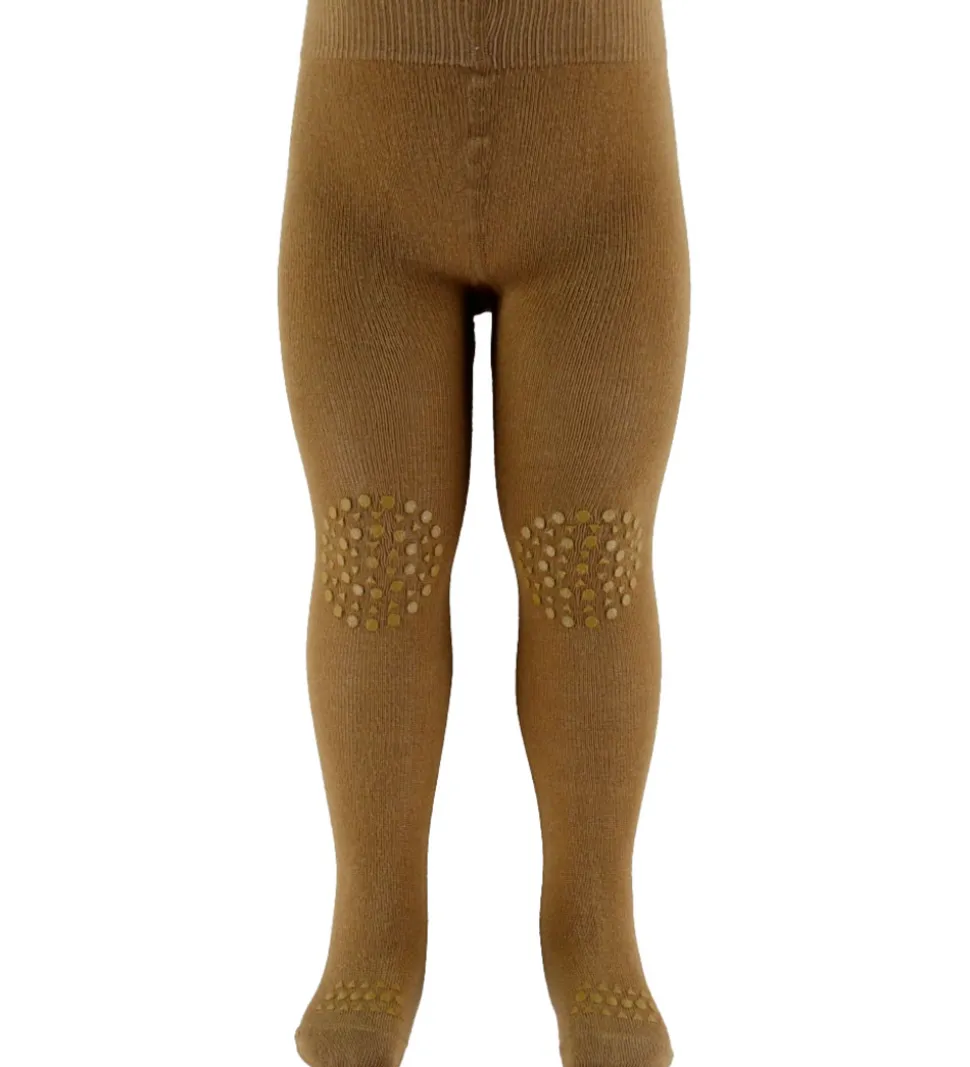 Lækre GoBabyGo kravlestrømpebukser i lysebrun, og de har gummidutter på og under foden samt på knæene.