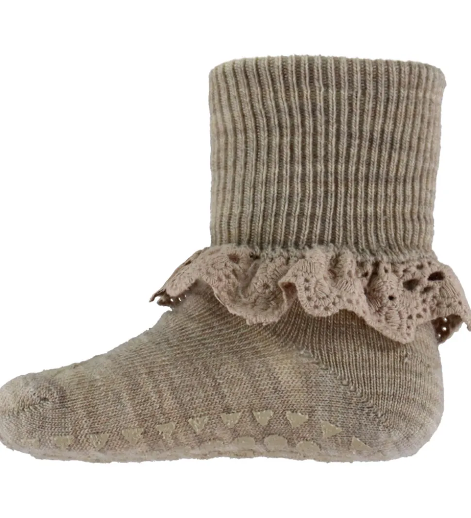 Lækre GoBabyGo skridsikre strømper i meleret beige med en flot blondeflæse rundt om skaftet.