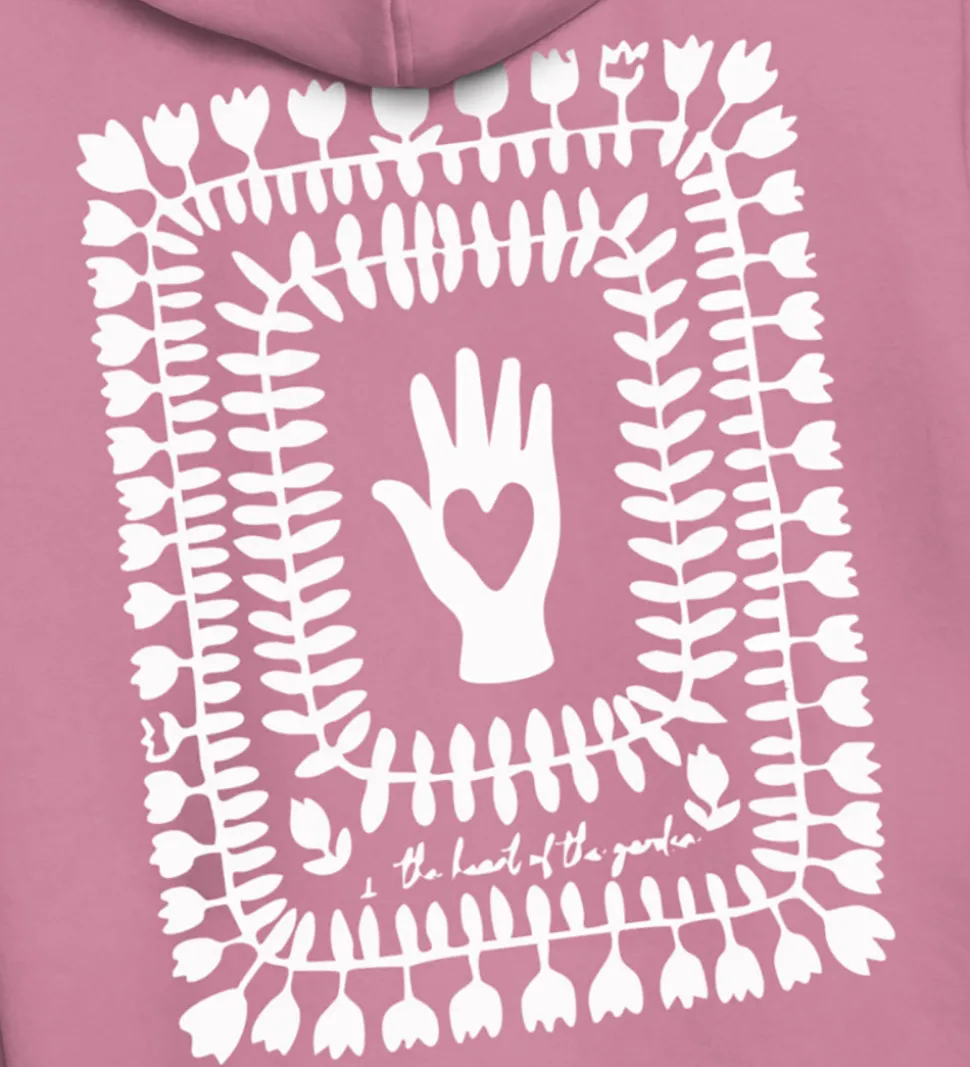 Flot Grunt hættetrøje i lyserød sweat, og på ryggen er der et stort, hvidt print. Grunt hættetrøjen har en klassisk kængurulomme foran og en rummelig hætte. Den har brede ribkanter, der giver en god pasform, og på indersiden er der blødt, børstet bomuld.