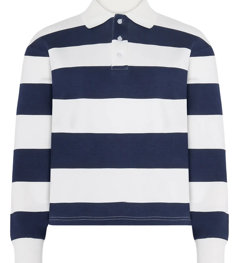 Stilfuld Grunt polobluse i stribet mørkeblå og hvid i lækker sweatkvalitet. Poloblusen har en klassisk krave og to knapper fortil. Den har lange ærmer med brede ribkanter, og i bunden er der en kort slids i begge sider. Indvendigt er der blødt, børstet bomuld.