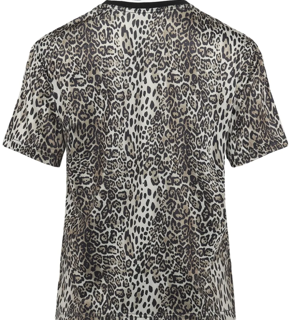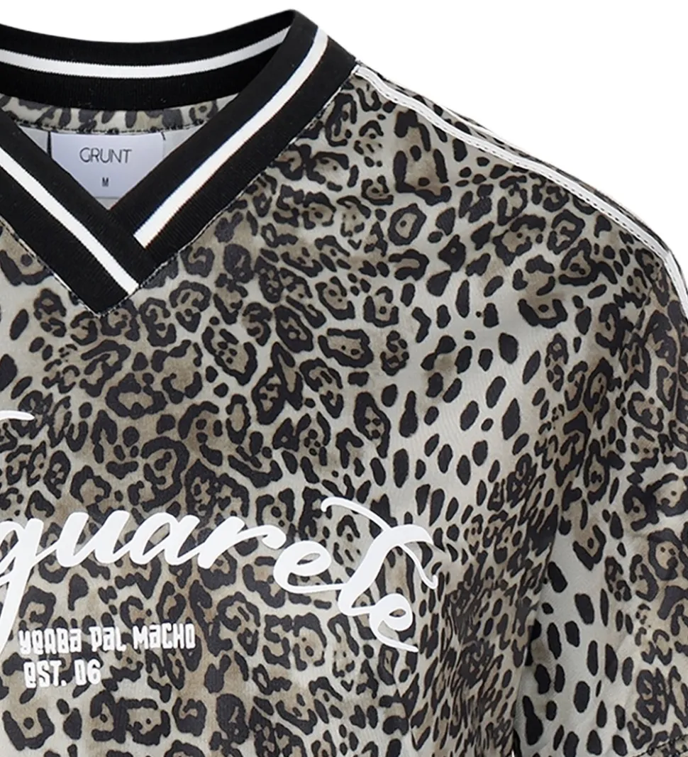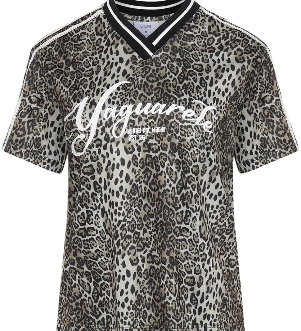 Flot Grunt t-shirt med et leopardprint i nuancer af brun og sort. T-shirten har et markant hvidt print på brystet med teksten “Yaguarete” og ved skuldrene er der to hvide bånd med blondekanter. Grunt t-shirten er designet v-udskæring med en ribkant og korte ærmer.