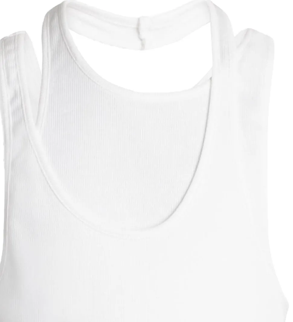 Grunt toppen har brede stropper med smalle ribkanter og en rund halsudskæring også med en smal ribkant. Den har to ekstra stropper, så det fremstår som to toppe. Toppen er lavet i en lækker og strækbar kvalitet.