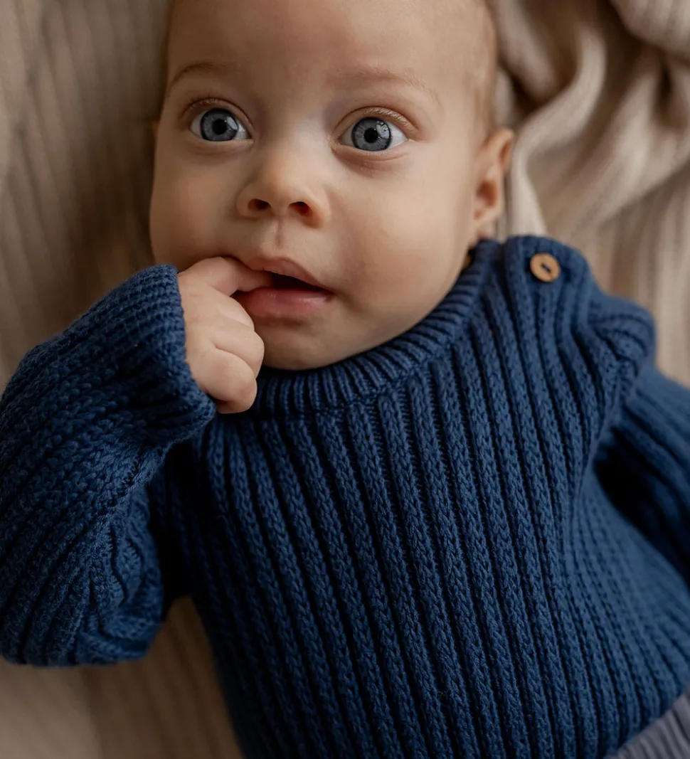 Flot Hanevild body i blå med strikket ribstruktur. Bodyen har en rund halsudskæring med knapper ved venstre skulder og lange ærmer. Bodyen lukkes med knapper mellem benene.