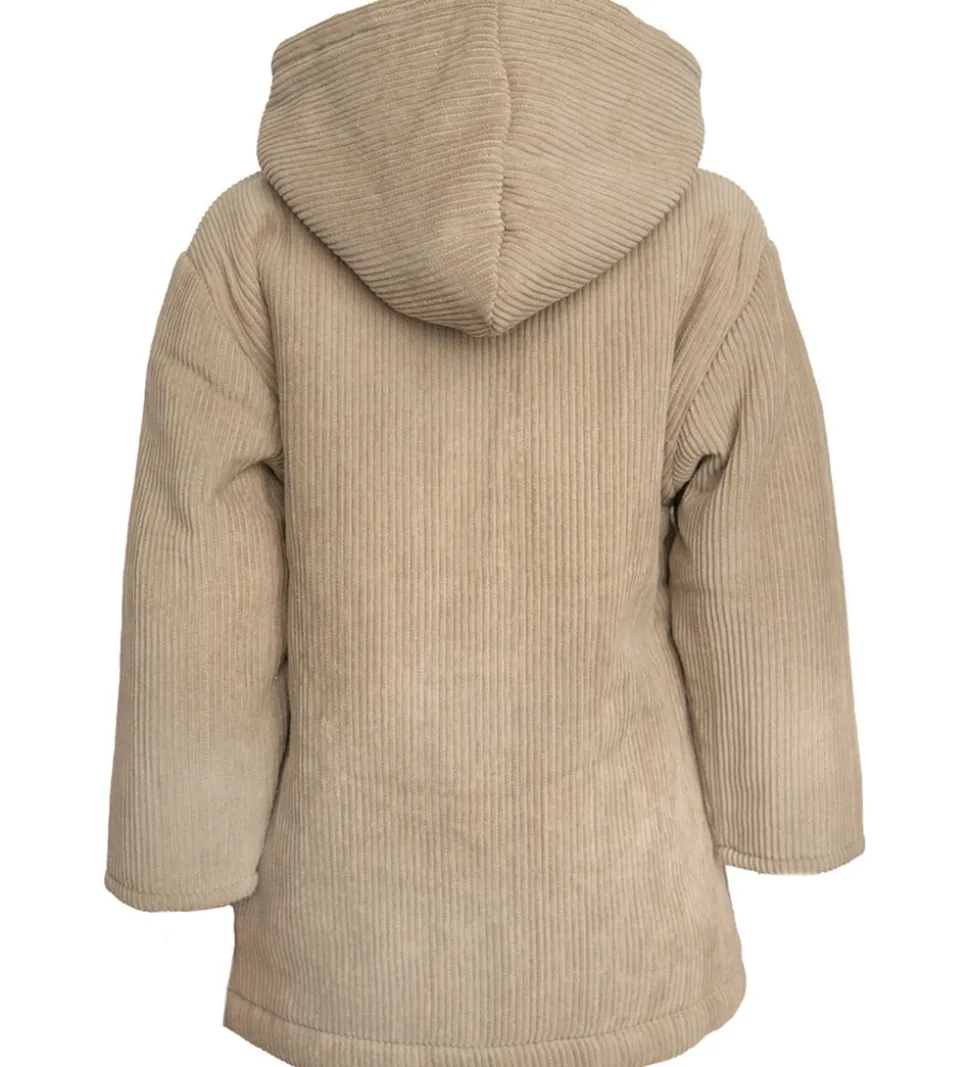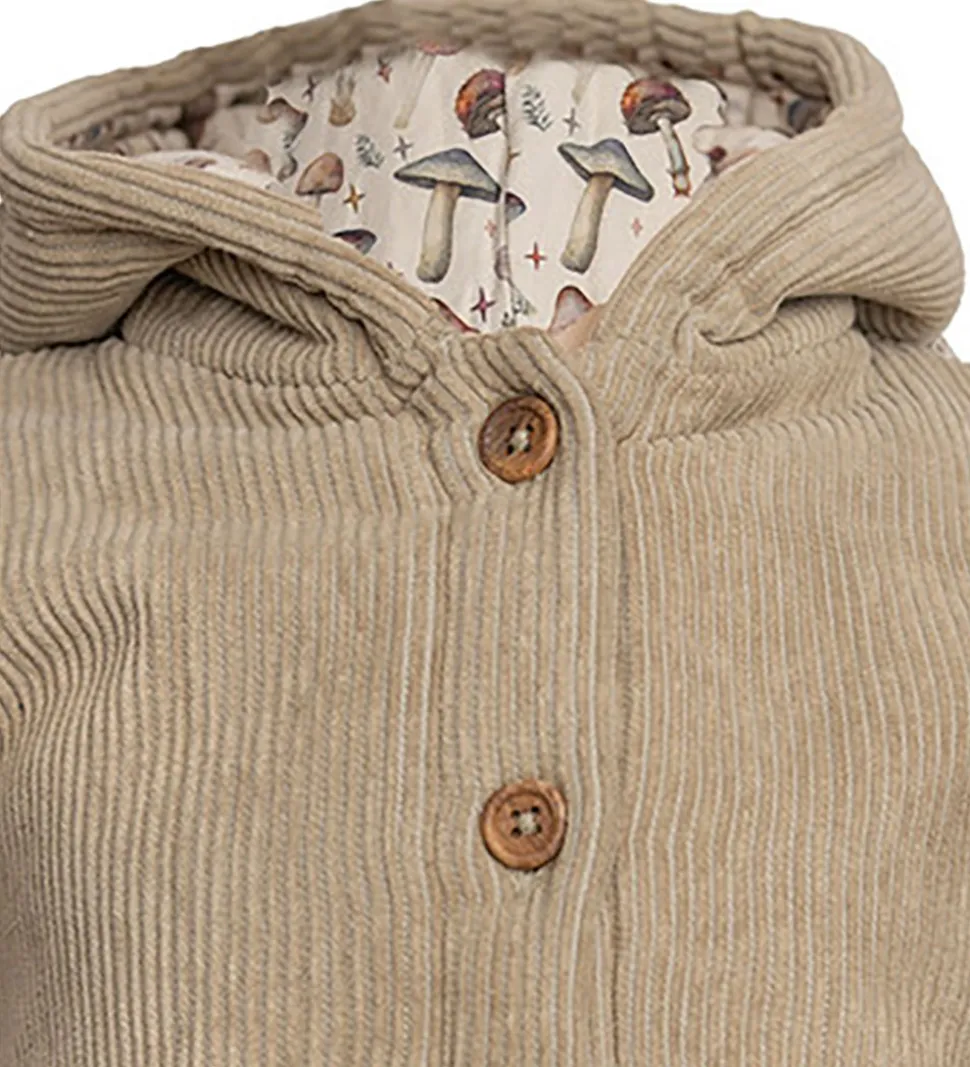 Flot Hanevild jakke i en varm, beige nuance og med en lækker fløjlstruktur. Hanevild jakken har lange ærmer og en praktisk hætte. Indvendigt er der et fint svampeprint, som giver et charmerende udtryk. Jakken åbnes fortil med gennemgående træknapper.