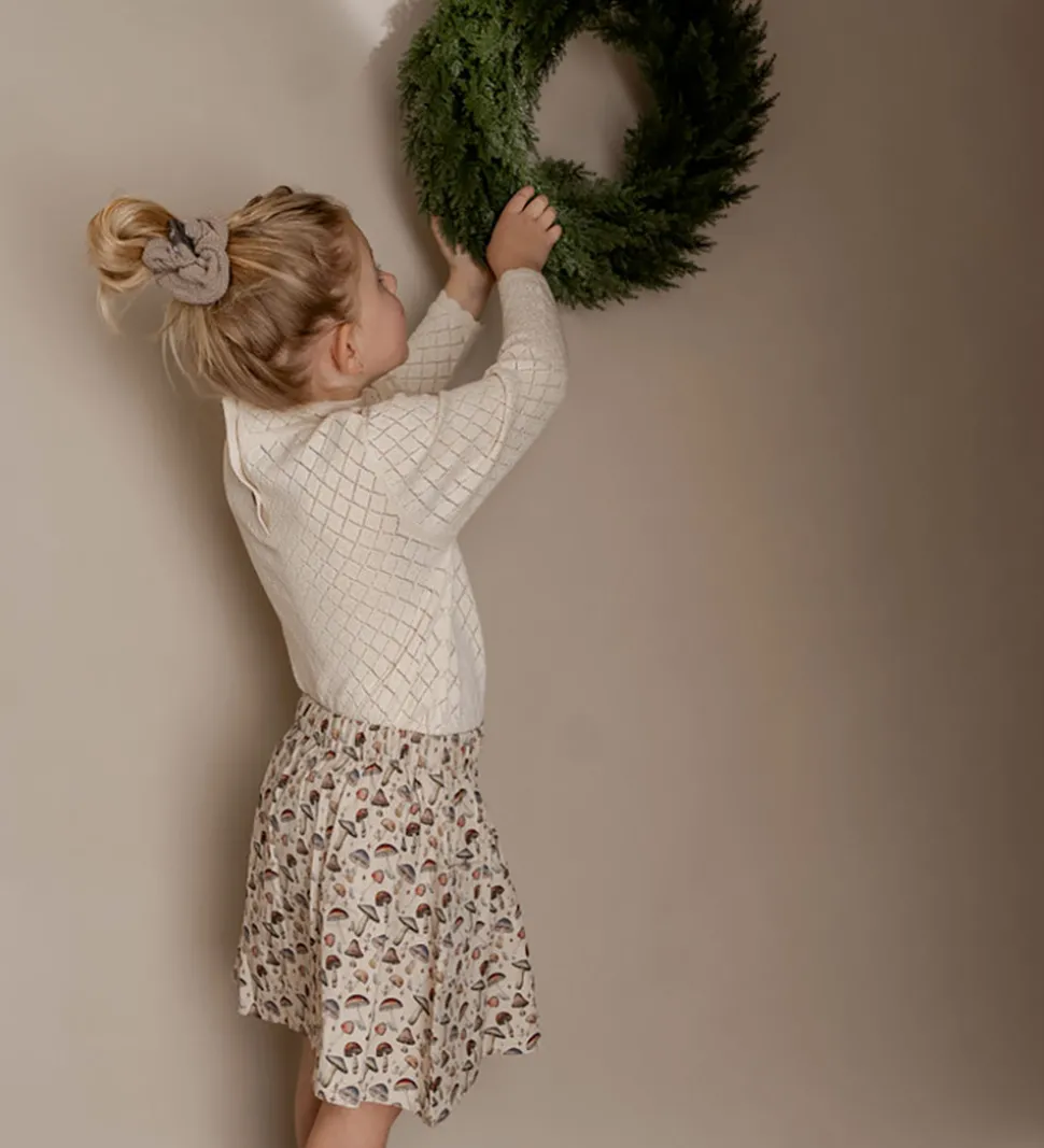 Charmerende Hanevild nederdel i beige med et farverigt, detaljeret svampeprint. Hanevild nederdelen har en elastisk talje, der sikrer en god pasform, og fine lommer på siden. Farverne på nederdelen er dæmpede og naturlige, hvilket giver et stilfuldt udtryk.