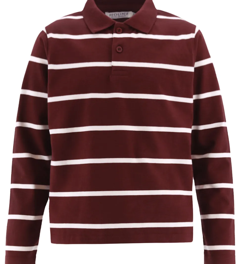 Elegant Hound polo med lange ærmer og et klassisk, tidløst design. Poloen er i en mørk rød nuance og har brede, horisontale hvide striber, hvilket giver et stilrent udtryk. Hound poloen er forsynet med knapper ved halsåbningen for nem justering.