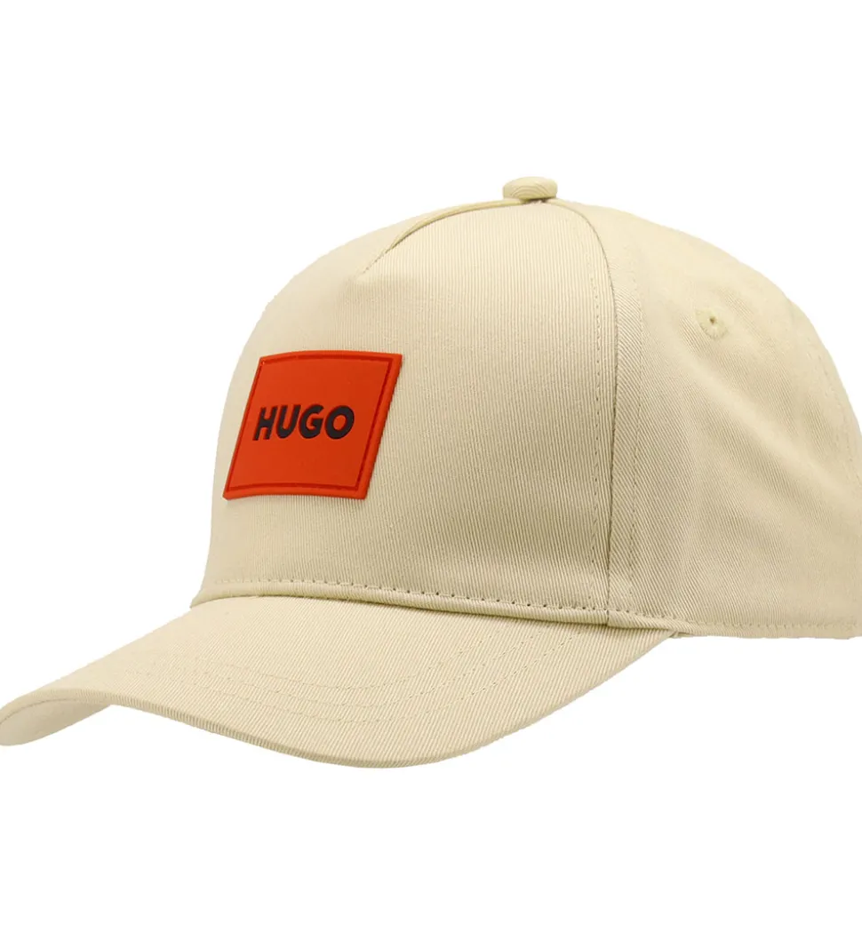 Skøn HUGO kasket i lys beige, og fortil sidder der et stort, rødt gummimærke med navnet “Hugo” i sort indeni.