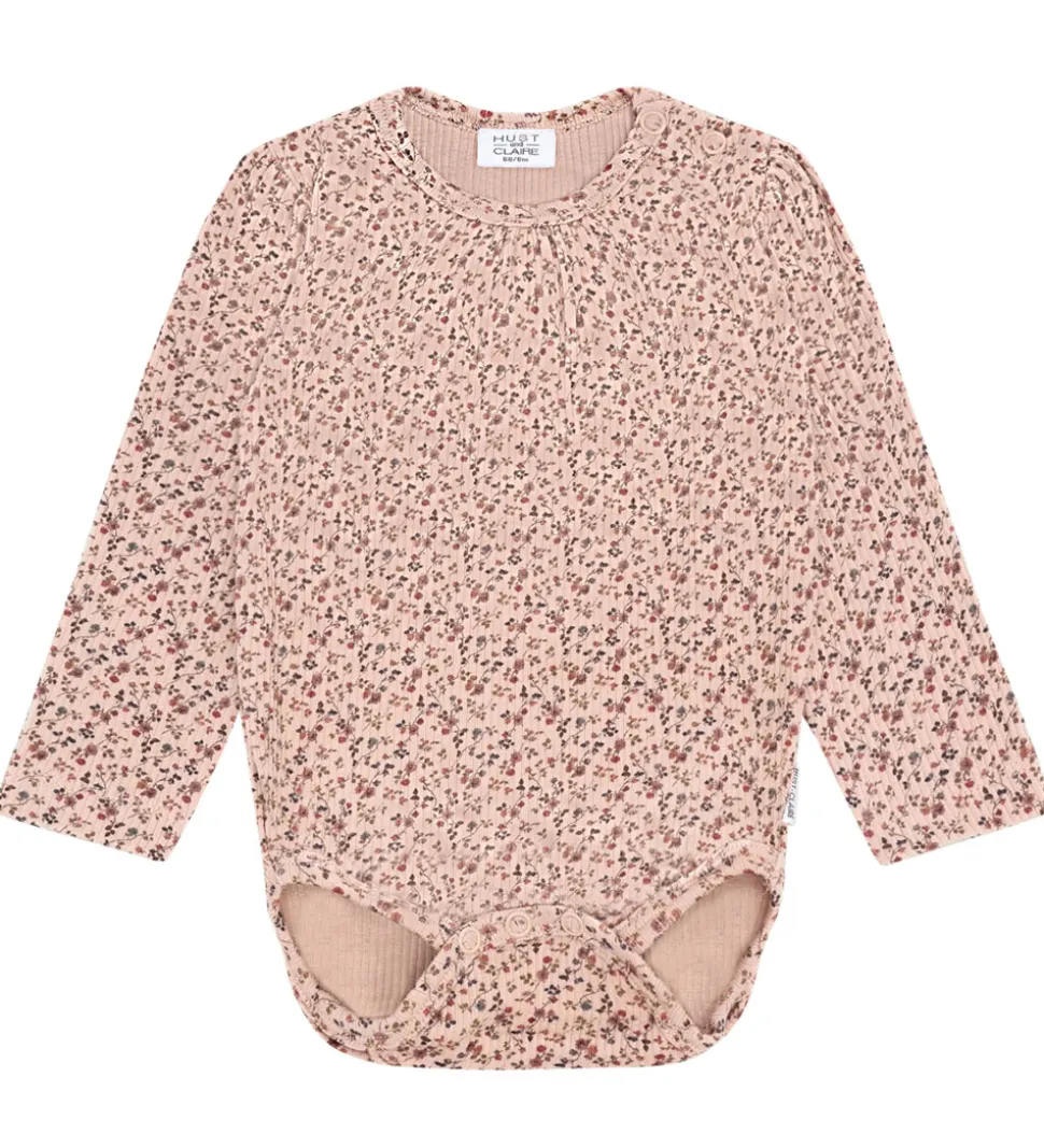 Charmerende Hust and Claire body i en blød rosa nuance med et delikat blomstermønster. Bodyen har lange ærmer og en rund halsudskæring, der giver et klassisk udtryk. Hust and Claire har designet denne body med fine rynkedetaljer ved halsen, som tilføjer et elegant touch.