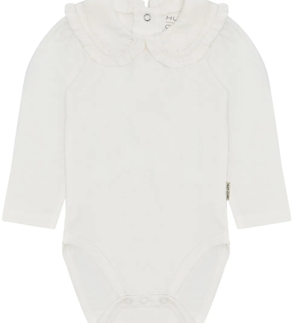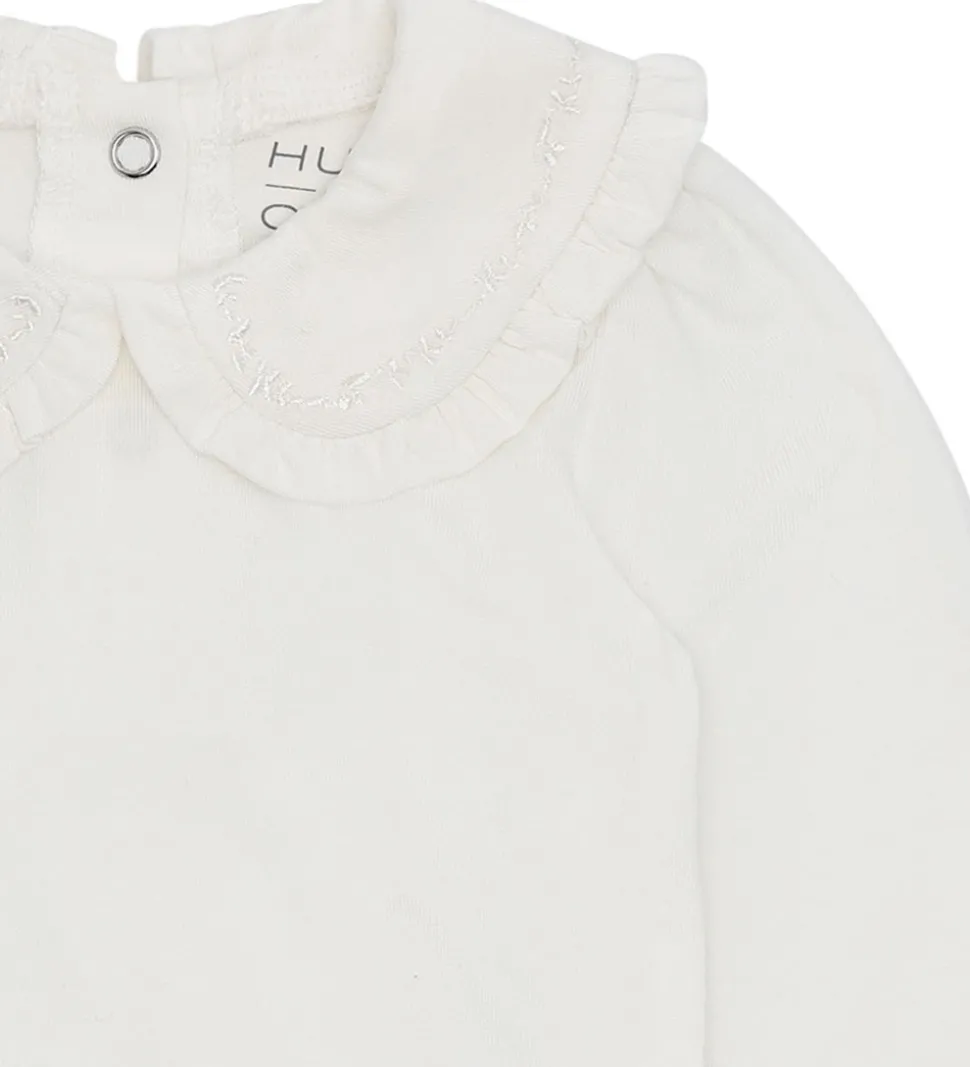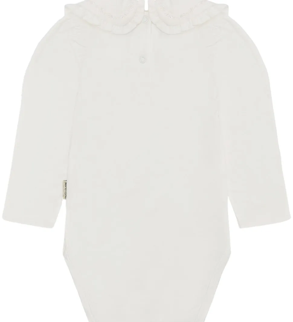 Elegant Hust and Claire body med lange ærmer i en ren hvid nuance. Bodyen har en smuk krave med fine flæsedetaljer, som giver et stilfuldt udtryk. Hust and Claire body er den perfekte tilføjelse til garderoben.